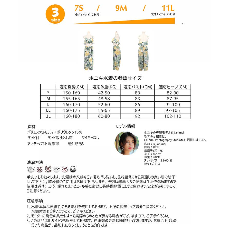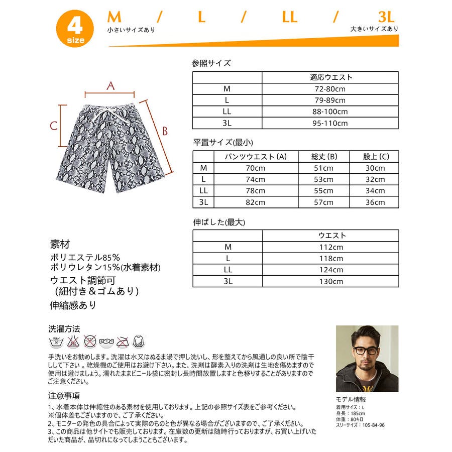| 注意事項 | 1、水着本体は伸ばせば伸びる物ですし、個体差もございますので、上記の参照サイズ表と平置サイズ表をご参考にしてくださいませ。 2、モニターの発色の具合によって実際のものと色が異なる場合がございますので、ご了承ください。 3、この商品は他サイトでも販売しております。在庫数の更新は随時行っておりますが、お買い上げいただいた商品が、品切れになってしまうこともございます。 |