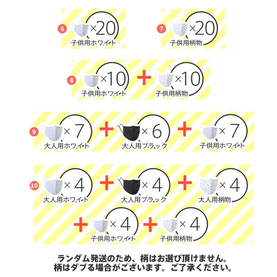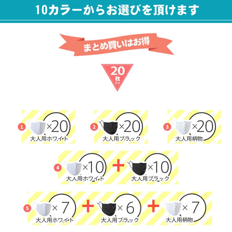 | カラ- | 大人 白20枚 / 大人 黒20枚 / 大人 柄20枚 / 大人 白10枚/黒10枚 / 大人 白7枚/黒6枚/柄7枚 / 子供 白20枚 / 子供 柄20枚 / 子供 白10枚/柄10枚 / 大人白7枚黒6枚/子供白7枚 / 大人白黒柄各4/子供白柄各4 |