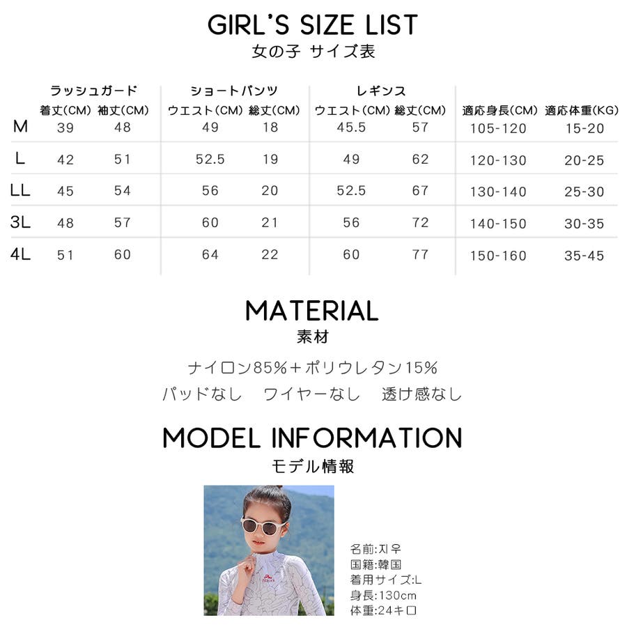 適応身長:M:105-120cm/L:120-130cm/LL:130-140cm/3L:140-150cm/4L:150-160cm