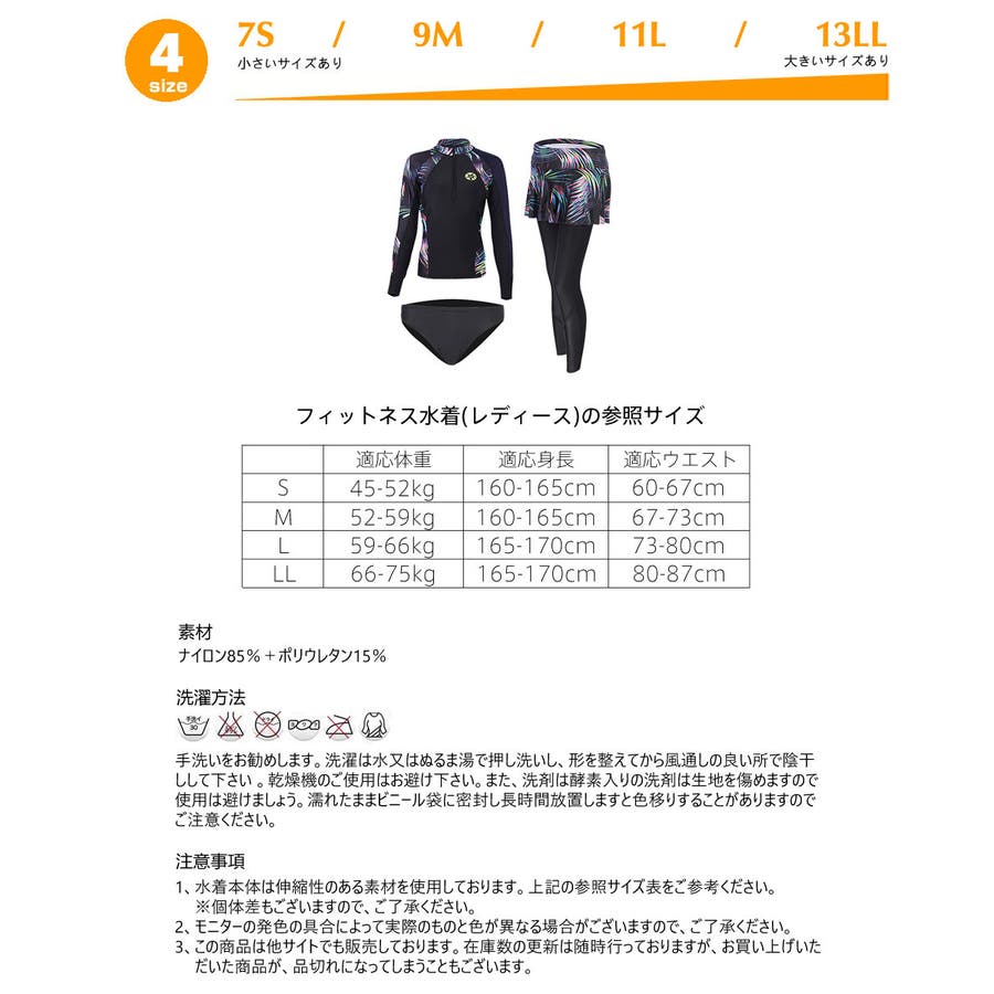 | 注意事項 | 1、水着本体は伸ばせば伸びる物ですし、個体差もございますので、上記の参照サイズ表と平置サイズ表をご参考にしてくださいませ。 2、モニターの発色の具合によって実際のものと色が異なる場合がございますので、ご了承ください。 3、この商品は他サイトでも販売しております。在庫数の更新は随時行っておりますが、お買い上げいただいた商品が、品切れになってしまうこともございます。 |