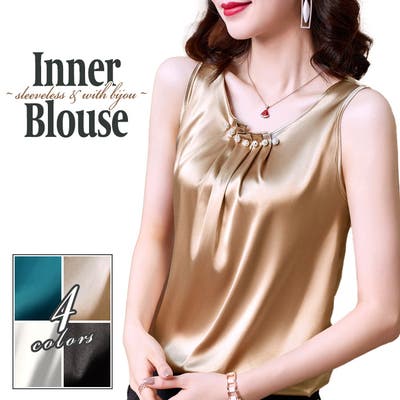 光沢感のある薄手のストレッチサテン キラキラのビジュー付き ノースリーブ インナーブラウス インナータンクトップ インナーキャミソール サテンタンクトップ サテンブラウス シルクタッチ 春夏 夏 レディース 韓国 韓国ファッション