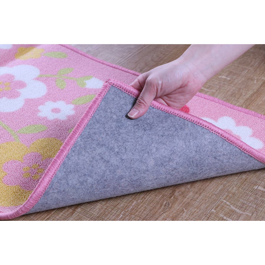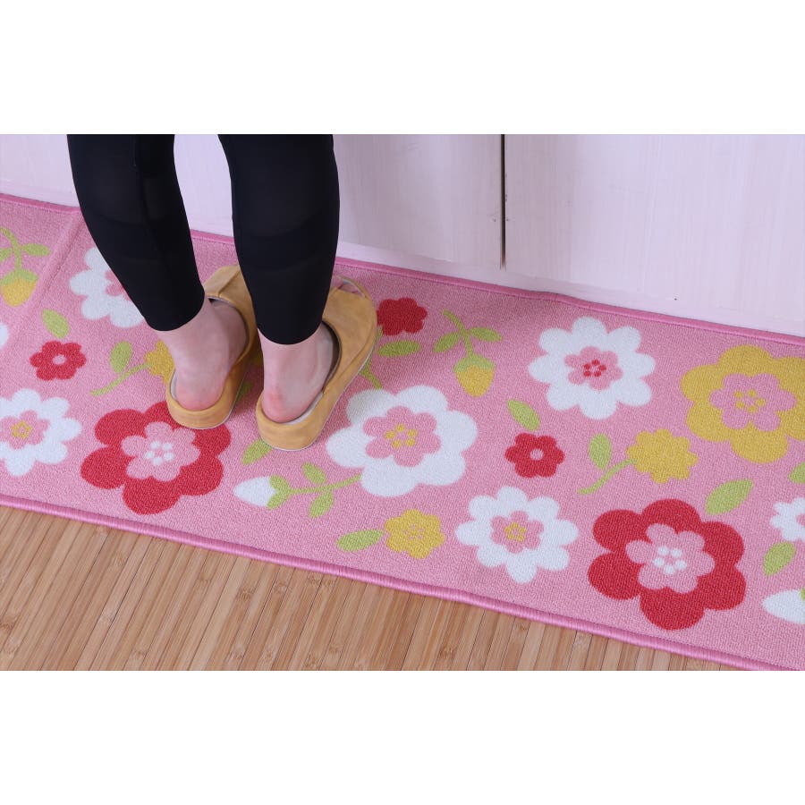 かわいい花柄をプリントしたキッチンマットです。表地にはナイロンを使用しています。ナイロンには強度があり摩耗に強いという耐久性に優れた面や、汚れが落ちやすく速乾性があるなどのマットに適した特徴があります。裏面にはすべりにくい加工を施しています。