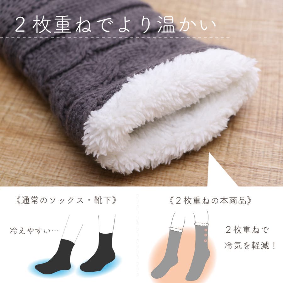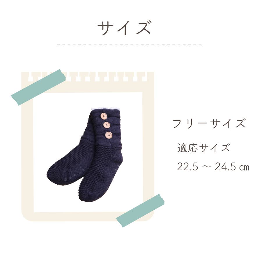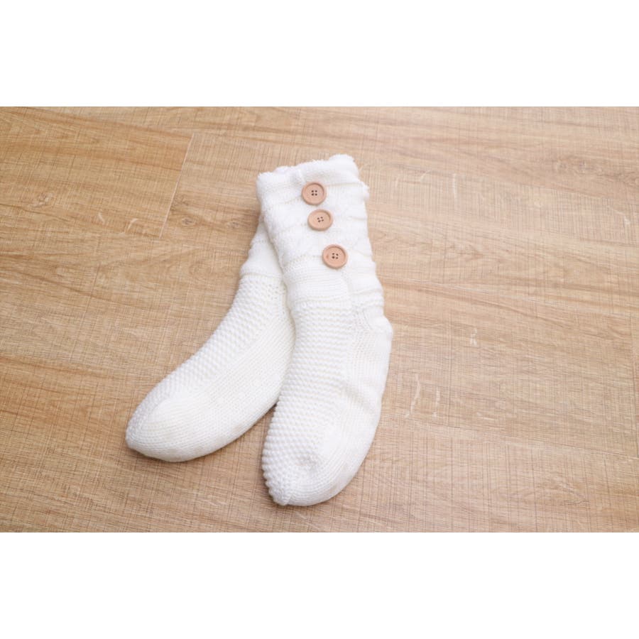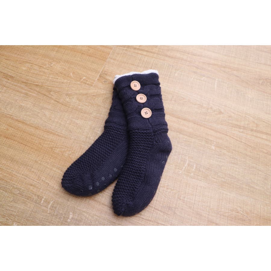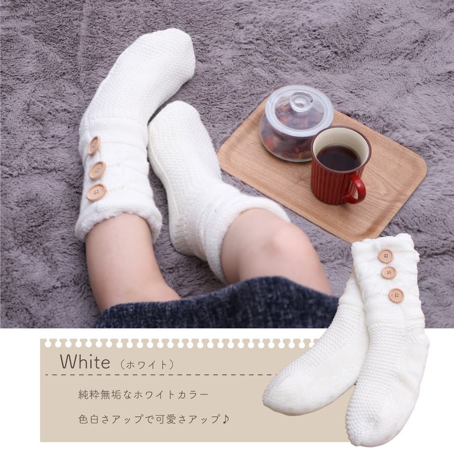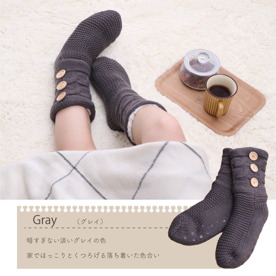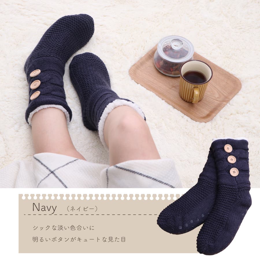 もこもこのシープボアを内側に使い冷えやすい足元もぽっかぽか。ニット素材との2重構造であたたかいです。底面にはすべりにくい加工を施しています。ワンポイントのボタンで可愛さアップ。■サイズ:フリー■原産国:中国製