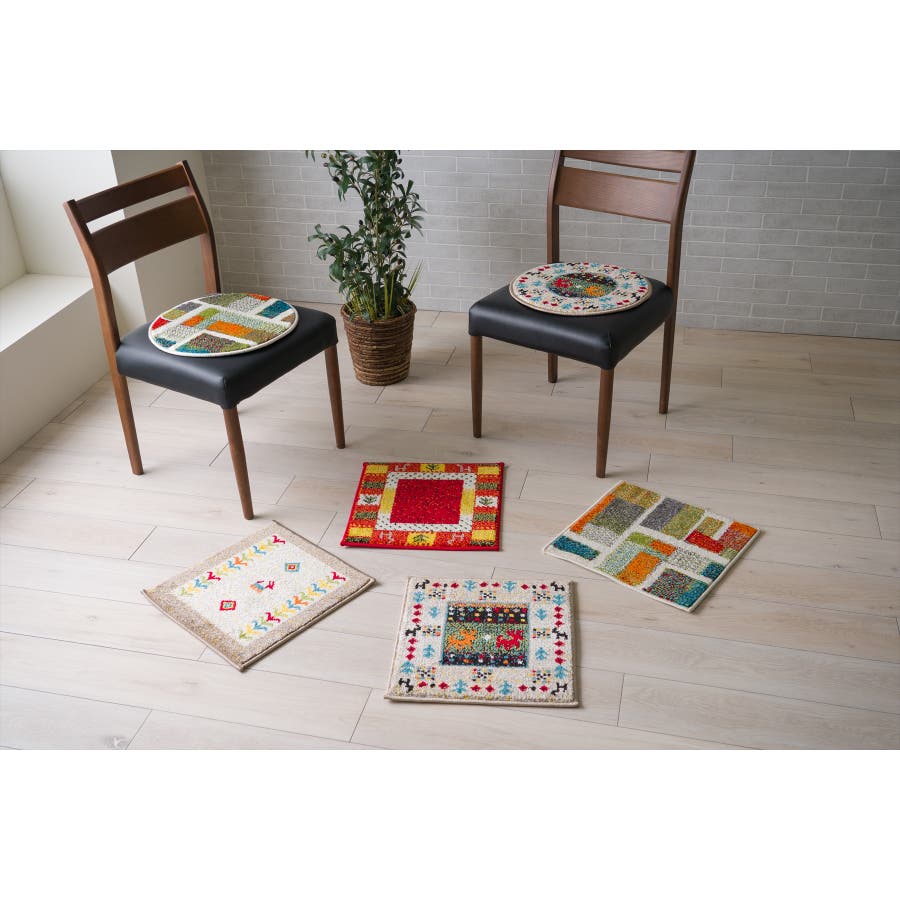 ■トルコ製のウィルトン織りチェアパッドです。本商品のパイル部分にはポリプロピレン素材を使用しております。ポリプロピレンはヘタリにくく、耐久性に優れ、繊維の中でも軽い素材です。また、汚れが付着しにくく、遊び毛や毛玉が非常に出にくいという特徴もあります。本商品にはフリーゼセット加工を施しております。フリーゼセット加工でパイルをツイストすることによりボリューム感を出し、ふかふかとした肌感触に仕上げました。。