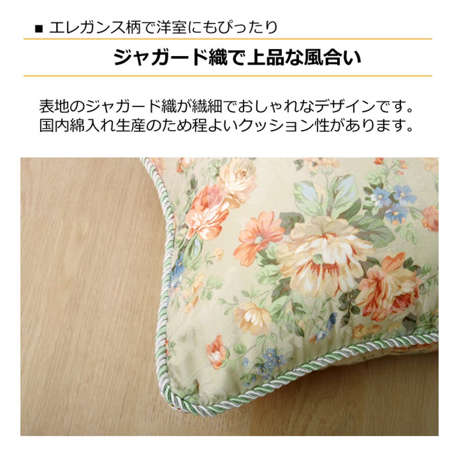 エレガンス柄のクッションです。人気の柄で洋室にもぴったりの商品です。表地にはジャガード織の生地を使用しているため繊細な柄と上品な風合いが特徴の商品です。国内で綿入れ加工をしているため程よいクッション性があります。
