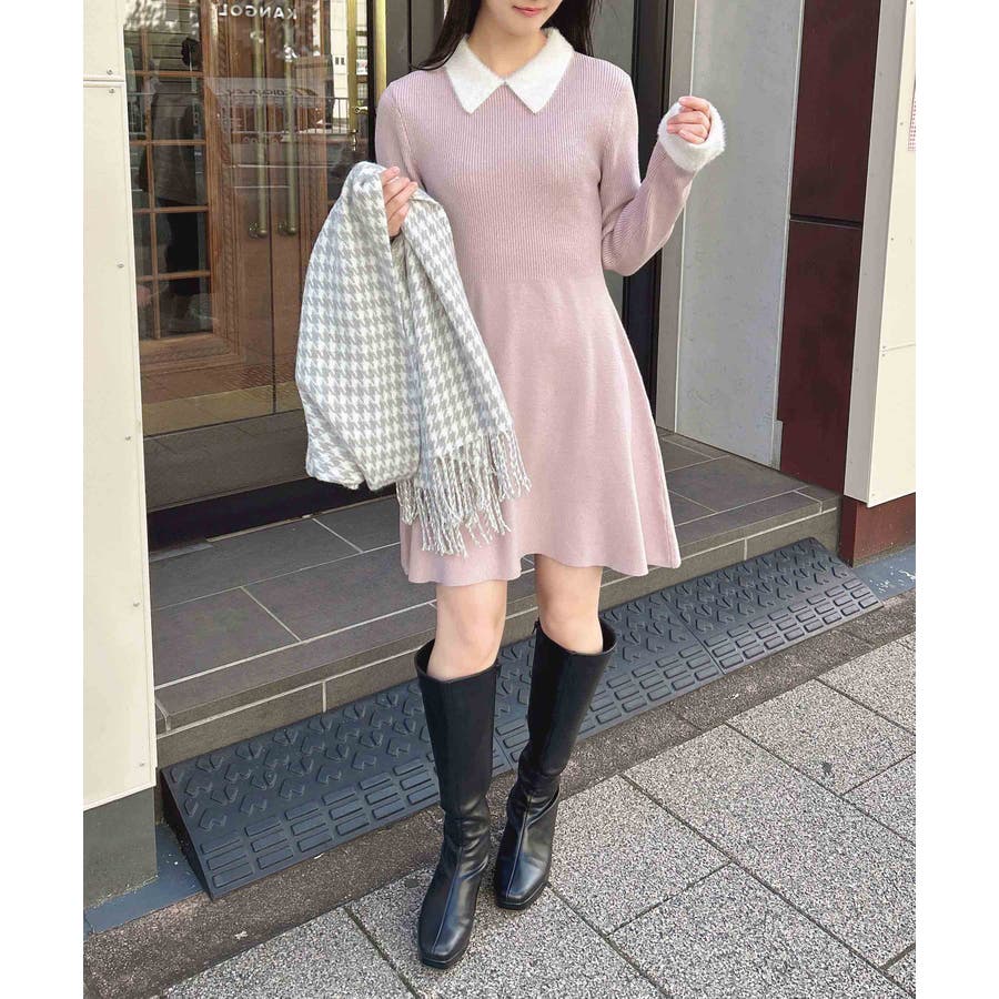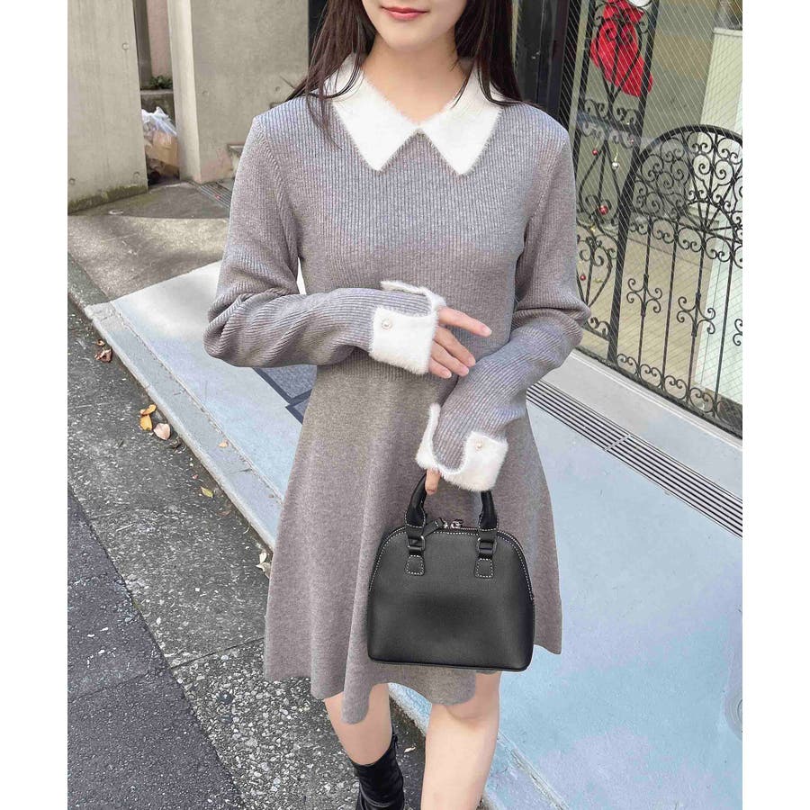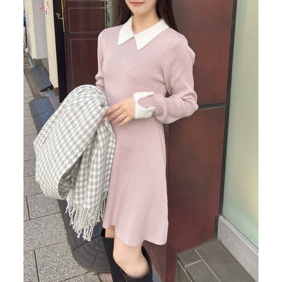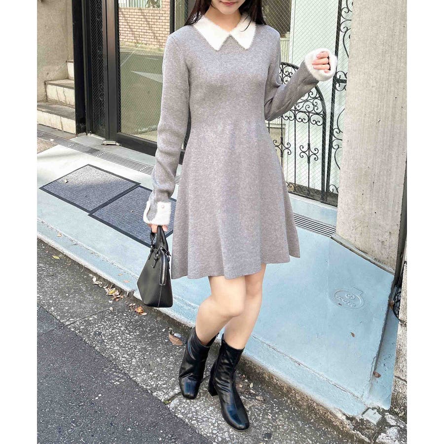 フェザー素材の襟のデザインが上品でかわいくお顔周りを華やかに見せてくれます。