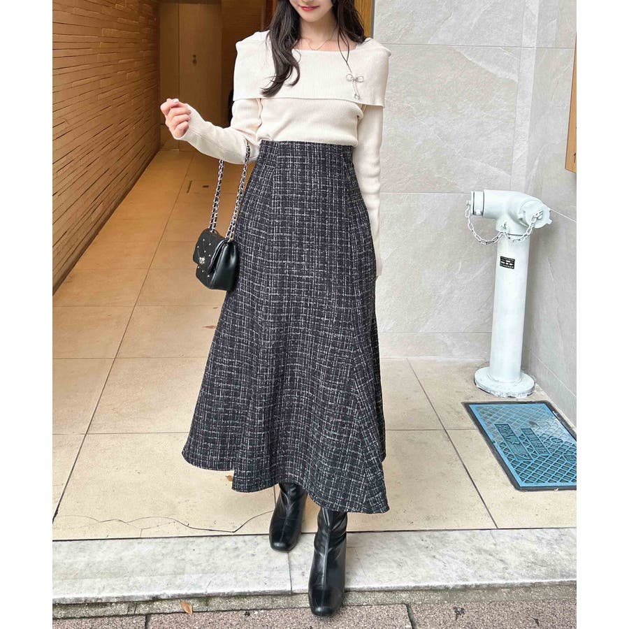 タイトなスカートやミニボトムは全身を女性らしいシルエットにまとめ、上品な印象に。