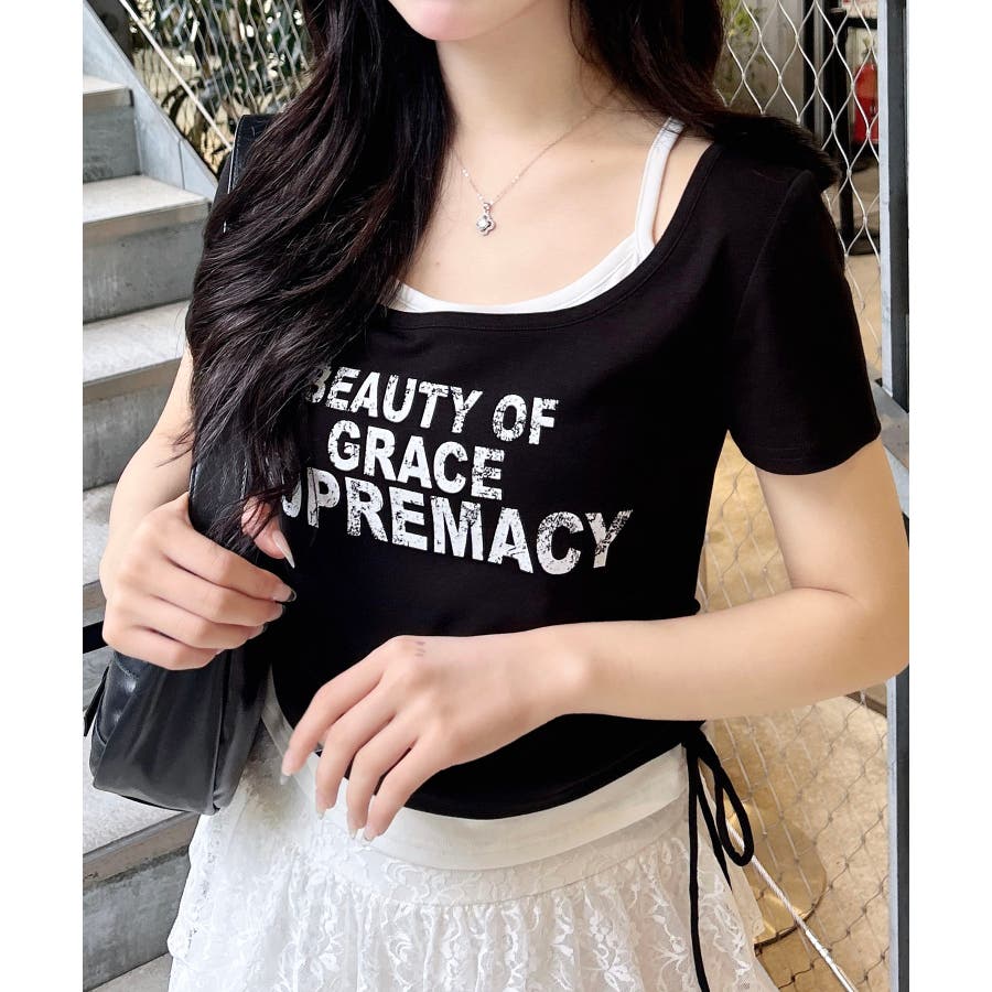 【まるでレイヤード!1枚で完成するおしゃれカジュアルトップス】▼Designフロントがキャミソールにトップスを重ねたような、2枚仕立てになった、レイヤード風トップス。ボディラインにフィットするコンパクトなシルエットでスタイルアップも狙えます。トレンド感のあるデザインがシンプルなコーディネートをぐっとおしゃれに見せてくれます。▼Stylingトレンドのプリーツスカートやスウェットパンツと合わせて韓国っぽく♪デニムやシンプルなスラックスと合わせたコーディネートも◎▼Recommend・レイヤード風・重ね着・大人カジュアル・ロゴデザイン・コンパクト・ギャザー