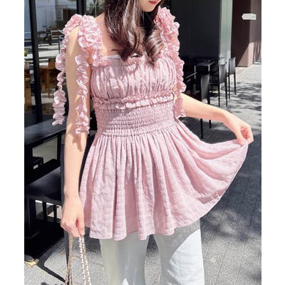 "【ショルダーの華やかなフリルが目を惹くミニキャミワンピ】