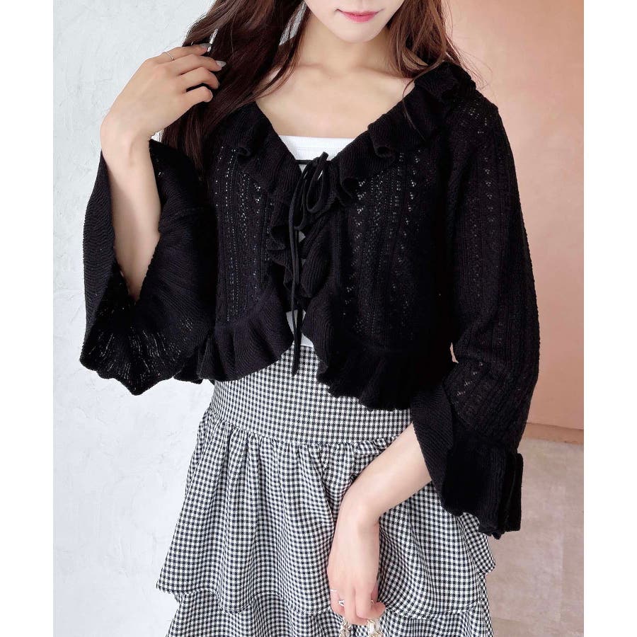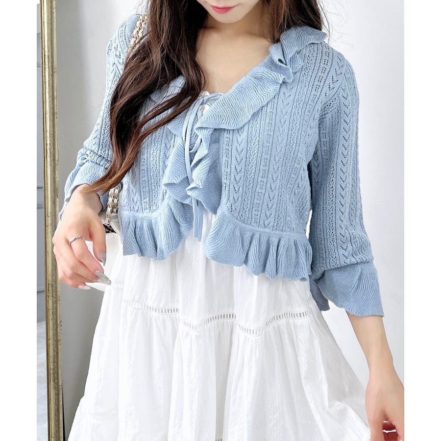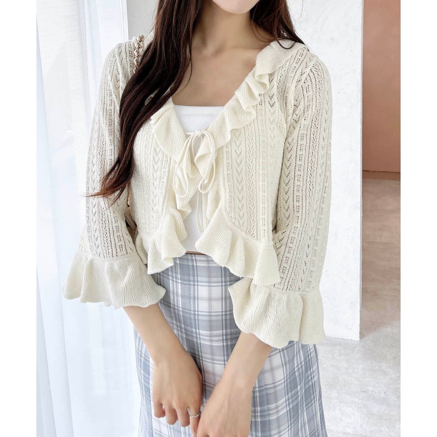 【ラッフル襟が可愛らしい、季節感あるパターンメッシュデザインのカーディガン】