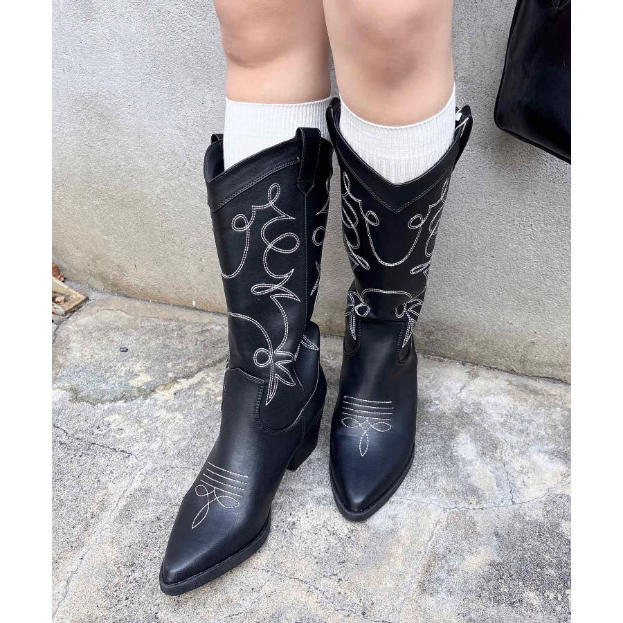【クラシックなウエスタンスタイルにモダンなエッジを加え、都会的な雰囲気を演出したトレンドブーツ】▼Designウエスタン風の切り替えデザインや刺繍がポイント。シャープなトウ部分はスッキリとした印象に。太めのヒールは安定感があり、履きやすさも抜群です。どんなコーディネートにもアクセントを加えてくれる今季一押しアイテム▼Stylingデニムやミニスカートに合わせて、かわいくカジュアルに決めて◎シンプルなトップスと合わせても、今年っぽいおしゃれが完成します。対応目安サイズMサイズ(23~23.5cm相当)Lサイズ(24~24.5cm相当)▼Recommend・トレンド・ロングブーツ・冬ブーツ・ウエスタン・カジュアル・アメカジ・古着風・韓国