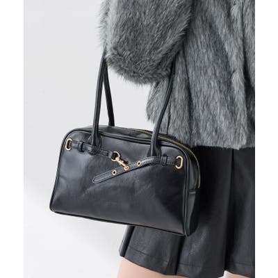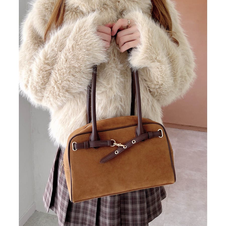 【お出かけシーンにもぴったりな小さめサイズのボストンバッグ】長めの持ち手はショルダー掛けも可能です。小振りながらもマチがあるので見た目以上の収納力。フロントに斜めに配置したベルトがスタイリッシュなアクセントになっています。内側には小物を入れるのに便利なポケット付き。ツヤのあるフェイクレザーや落ち着いたフェイクスウェードがラインナップ。・A4サイズ不可・裏地あり・内ポケットあり・重量:約278g