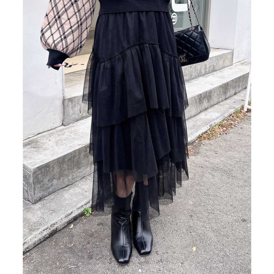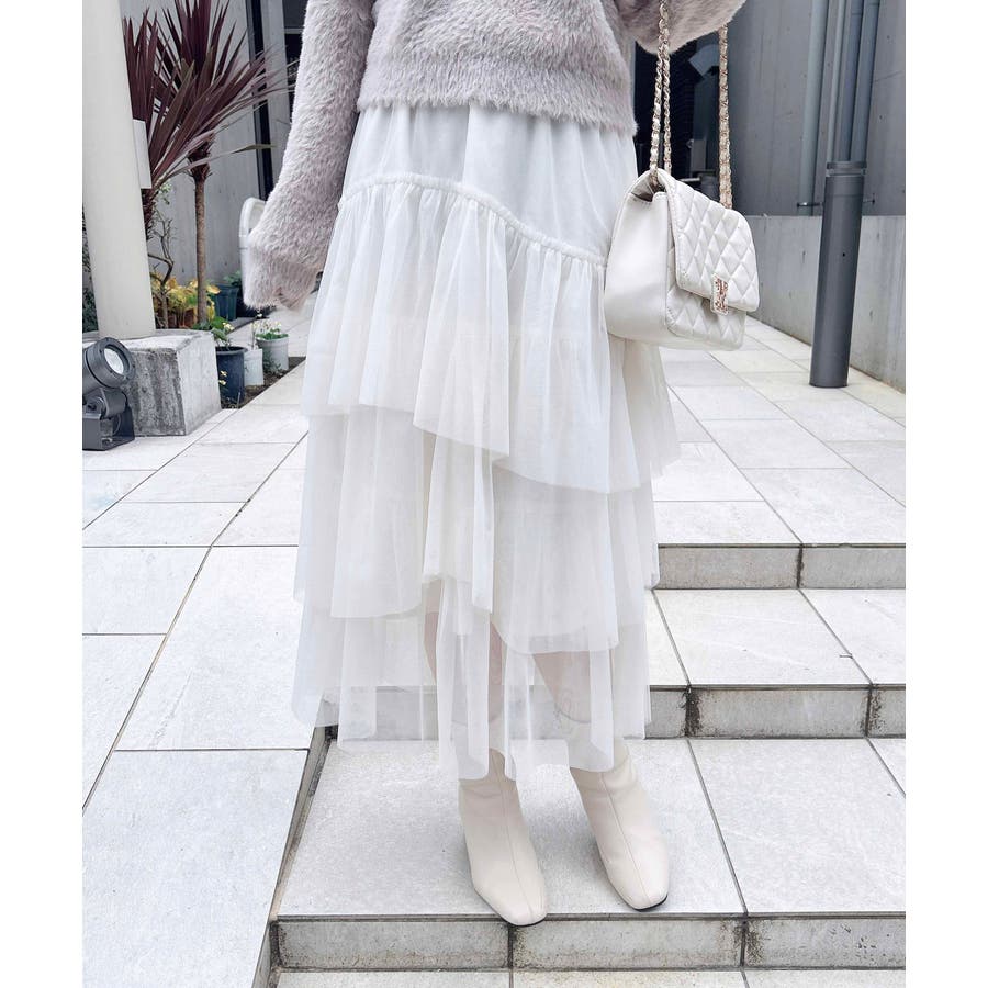 【これ一枚でこなれ感を演出してくれるチュールティアードスカート】▼Designトレンド感あふれる、ふんわりとしたシルエットが印象的なティアードスカート。やわらかいチュールの素材がフェミニンらしさを引き立たせます。デートやランチなどシーンを問わずに着用できるアイテムです。▼Stylingシャギーニットに足元はヒールを合わせてエレガントなスタイルに。パーカーやスニーカーを合わせればカジュアルな印象に。ランチやちょっとしたお出かけにぴったり!・バックウエストゴム▼Recommend・ティアードスカート・チュール・フェミニン・ガーリー・エレガント・ミモレ丈