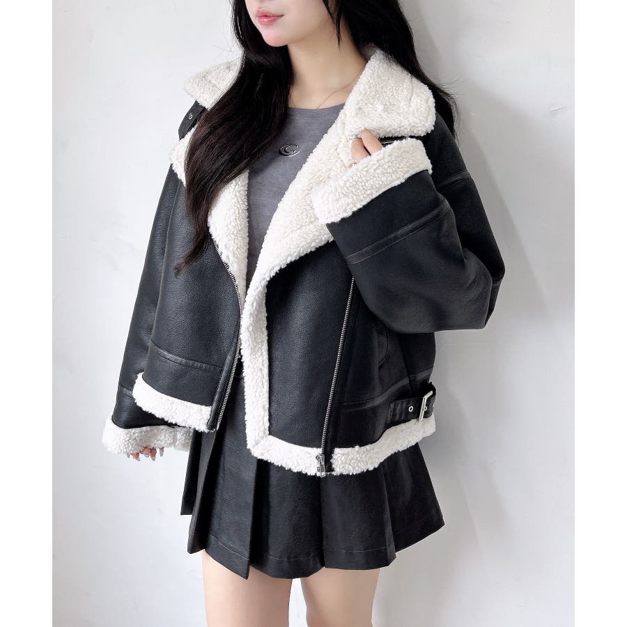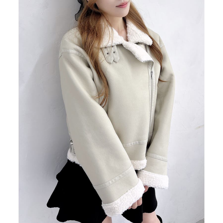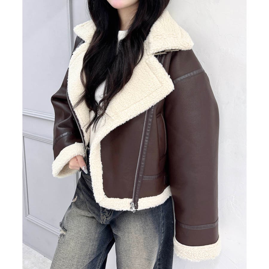 【もこもこあったかい♡ショート丈ムートンフライトジャケット】▼Design暖かさ抜群のムートンコートから、短めクロップド丈のフライトジャケットが新登場!外側のムートンはとてもやわらかく、思わず触りたくなる質感で、動きやすく快適な着心地です。クロップド丈なので、重たくなりすぎず、スタイルアップまで狙えちゃう!▼Stylingクロップド丈なので、ルーズなパンツと合わせてもバランス良くクールに着こなせます。ハイウエストのボトムやタイトなボトムと合わせれば、スタイル爆盛れで、この冬一番のジャケットになる事間違いなし。▼Recommend・ムートンコート・フライトジャケット・アウター・トレンド・大人カジュアル・ショート丈