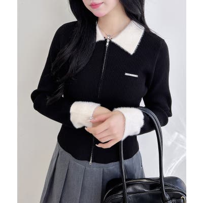 12Gリブ フェザー衿ダブルジップニットカーディガン