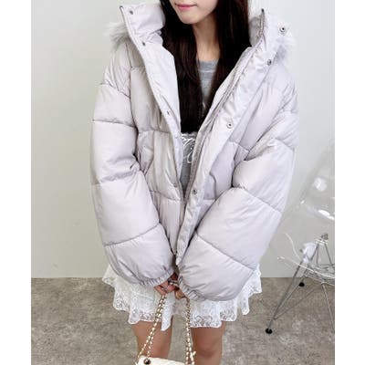 大きめフードにふわふわのエコファーがついた、ボリューミーな中綿ダウンジャケットです。