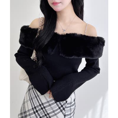肩紐のパールと胸元にあしらわれたエコファーがポイントのオフショルニットです!