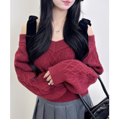 7G 2WAYベロアリボンオフショルケーブルニット
