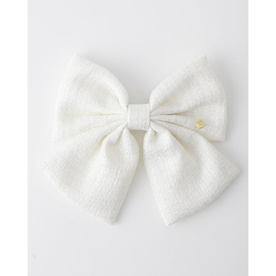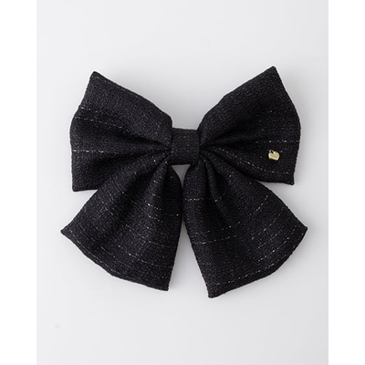 キラキラのラメを織り込んだツイード素材のリボンバレッタ。大きめのサイズでコーディネイトのアクセントにぴったりです。ブランドロゴが入ったハート型のゴールドパーツがキュート。サッとまとめてパチッと留められるのでヘアアレンジも簡単です。クラシカル&華やかなアイテムなのでオンオフ問わずに活躍すること間違いナシ。