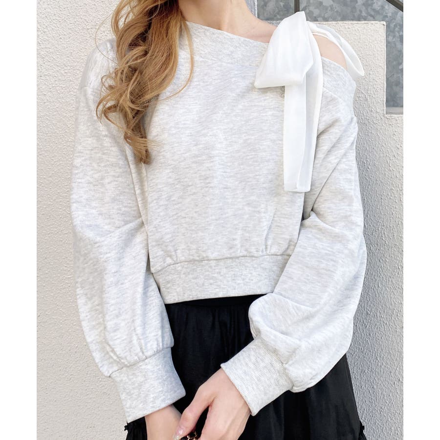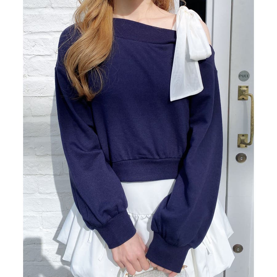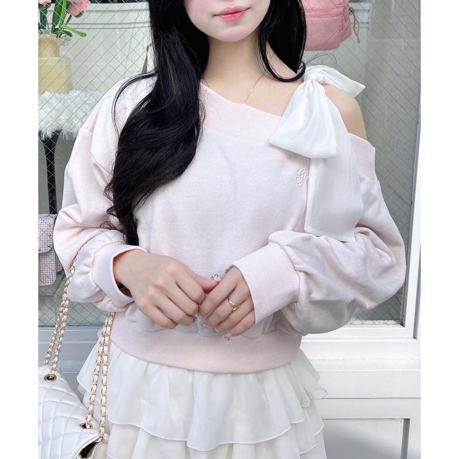 裏毛肩リボン胸ロゴワンショルTOPs