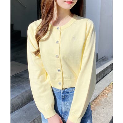 【ビジューボタンが華やかなニットカーディガン】▼Designお花のようなパールビジュー&ラインストーンのボタンが華やかな印象を演出してくれるアイテムです。胸元の刺繡ロゴもポイントです。柔らかい薄手のニット素材なのでこれからの季節にぴったり!カーディガンとしてもトップスとしても着用できる万能アイテムです♪▼Stylingロングスカートやスラックスを合わせたフェミニンなきれいめコーデがおすすめです。デニムやスニーカーを合わせてカジュアルなスタイリングにするのも◎【以下イエロー参考。カラーにより多少の誤差あり】・透け感:やや透ける・伸縮性:あり・生地の厚さ:普通・裏地:なし・ニット製品のため生地に伸縮性があり、サイズに若干の誤差が生じる場合がございます。予めご了承くださいませ。▼Recommend・ニット・カーディガン・ビジューボタン・ワンポイント・フェミニン・大人カジュアル