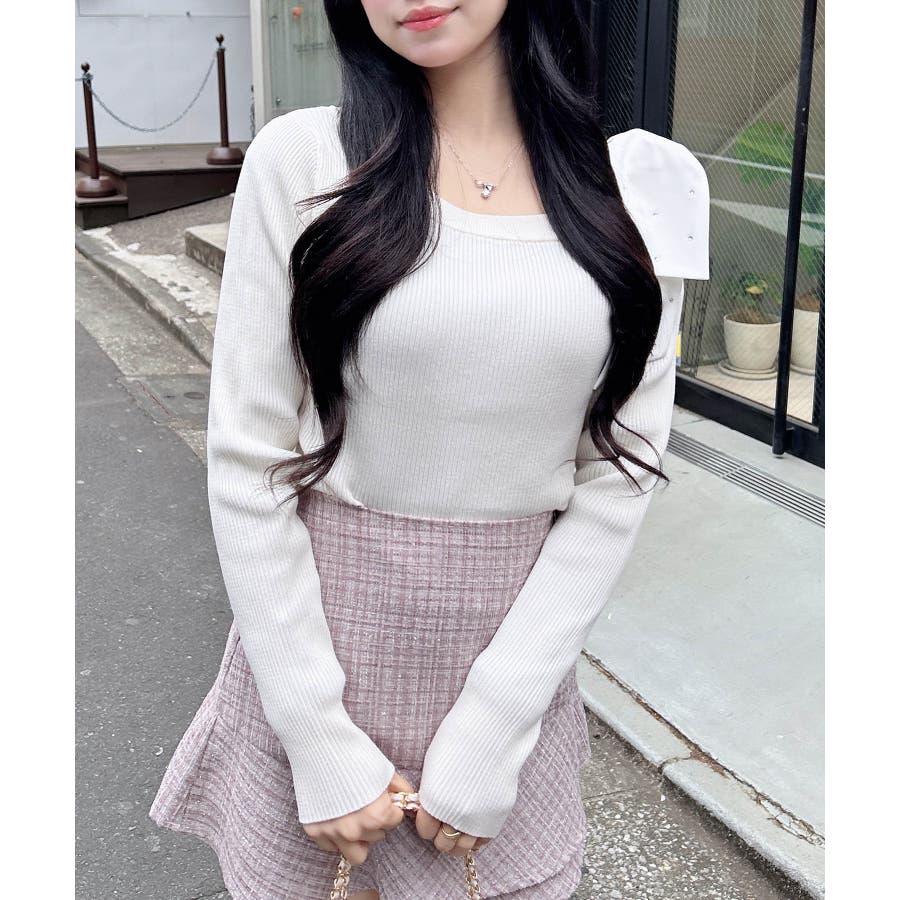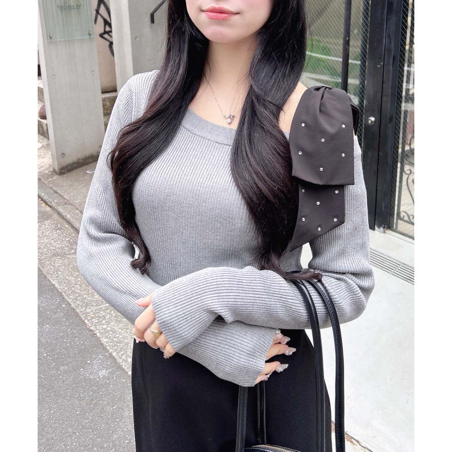 【定番の肩リボンニットにビジュー付きリボンタイプが登場!】▼Designワンショルデザインでヘルシーな肌見せが叶うデザインニット。肌触りの良いやわらかなニットで着心地も快適。ショルダー部分にあしらった異素材の大きなリボンにはビジューが付いているので華やかな印象を与えてくれます。▼Stylingロングスカートを合わせれば定番のフェミニンコーデに♪ミニスカートを合わせればガーリーコーデが楽しめます。デニムを合わせたカジュアルガーリーコーディネートもおすすめ◎デートはもちろん、参戦服としても活躍すること間違いなし♡・ニット製品のため生地に伸縮性があり、サイズに若干の誤差が生じる場合がございます。予めご了承くださいませ。▼Recommend・ワンショル・リボン・ビジュー・フェミニン・ニット・デート服・参戦服