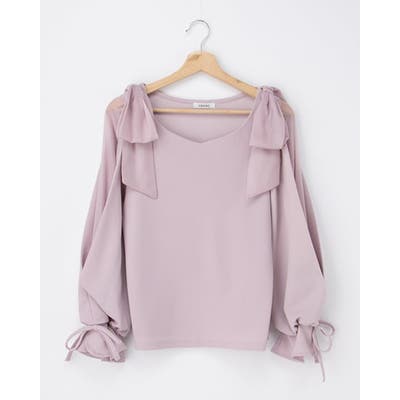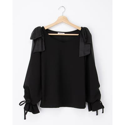 肩口の光沢のある大きなリボンと袖部分のシアー素材が