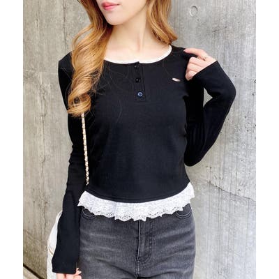 ヘンリーネックレース付プレートロゴ長袖リブトップス
