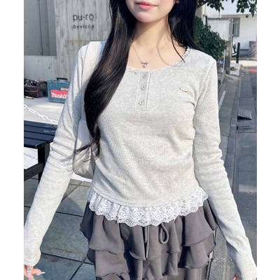 【すっきりと開いたヘンリーネックにレースをあしらったカジュアルガーリーなトップス】