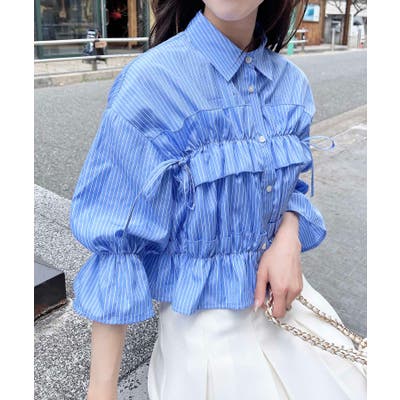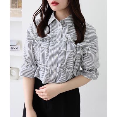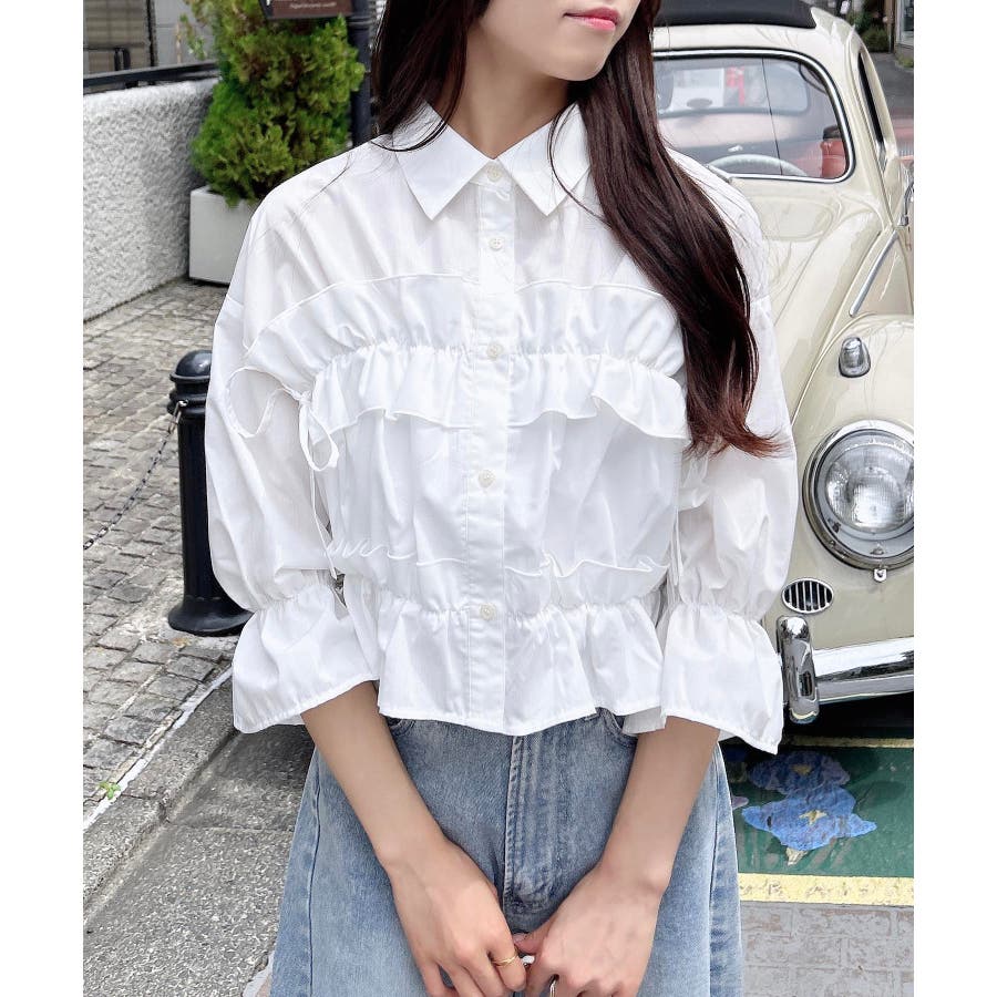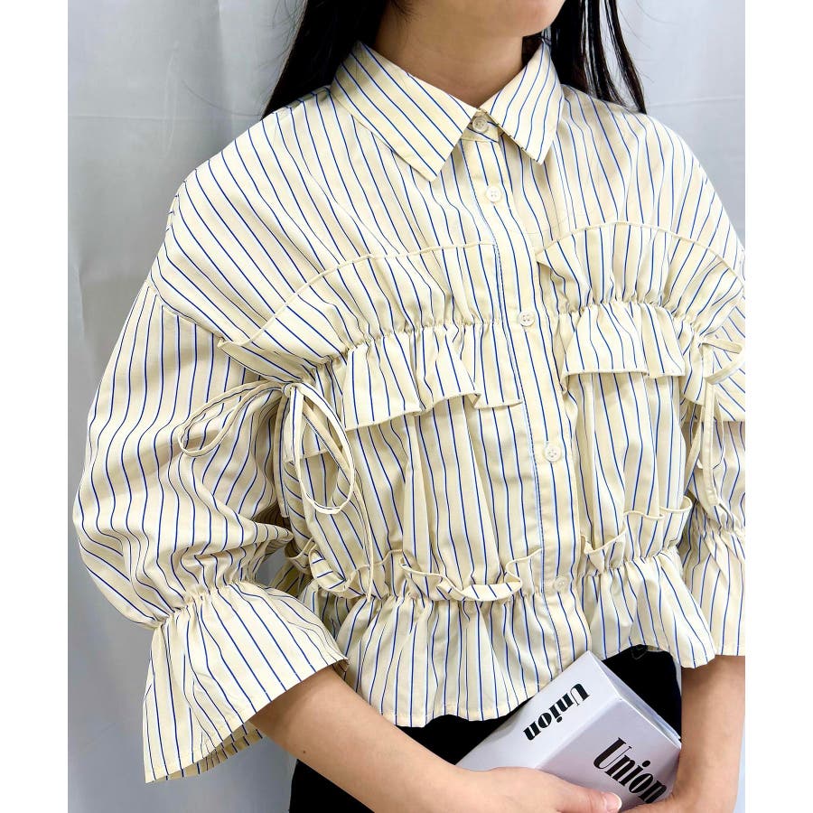 【フリル×リボンがフェミニンな魅力を引き立てるシャツブラウス】