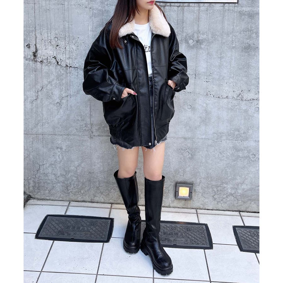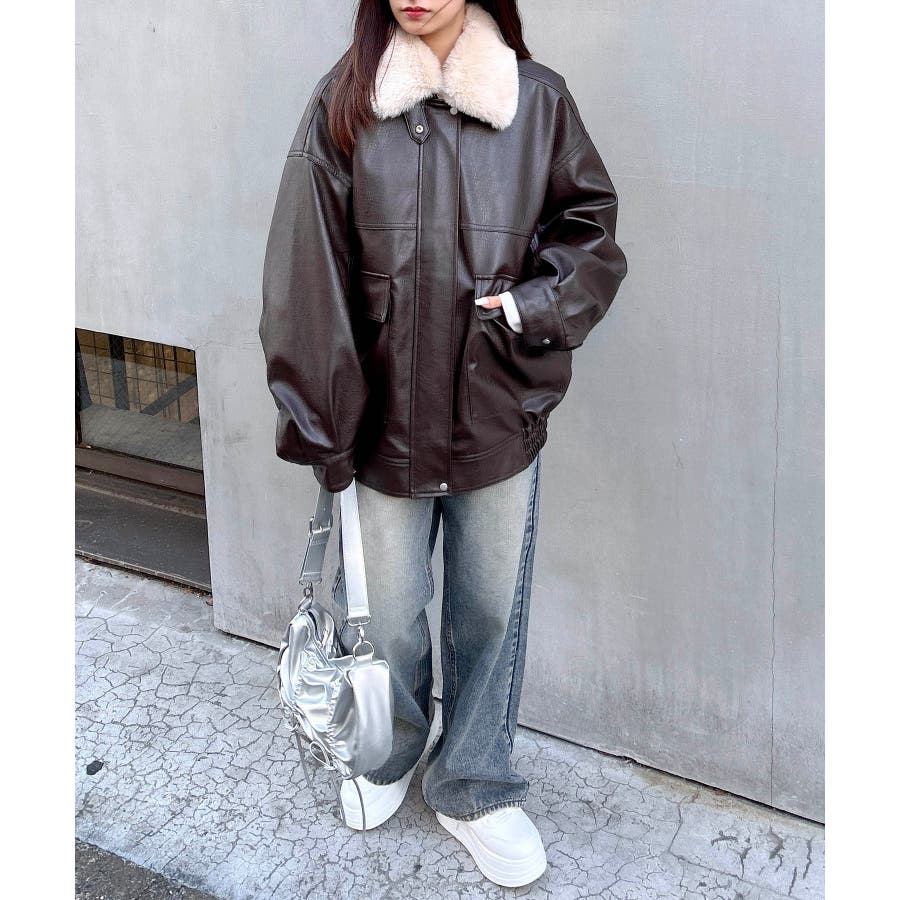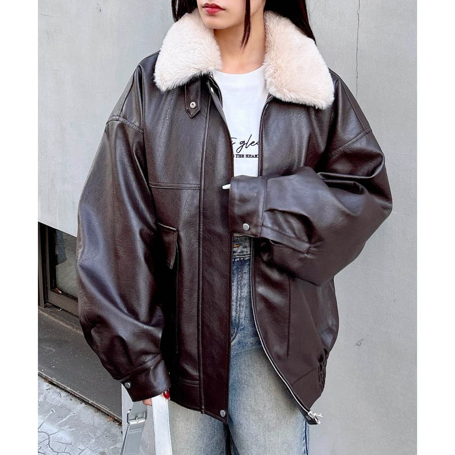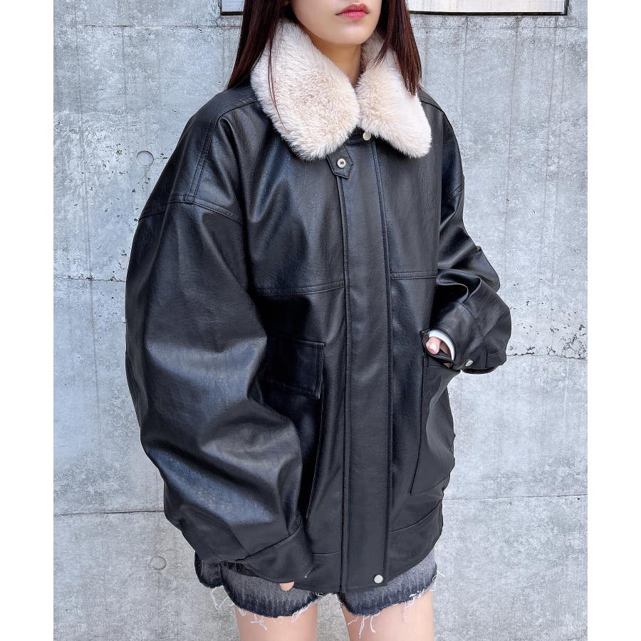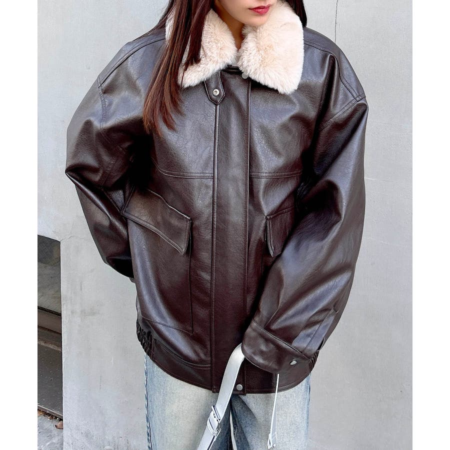 【首元のファー付き襟が目を惹くフェイクレザーアウター】