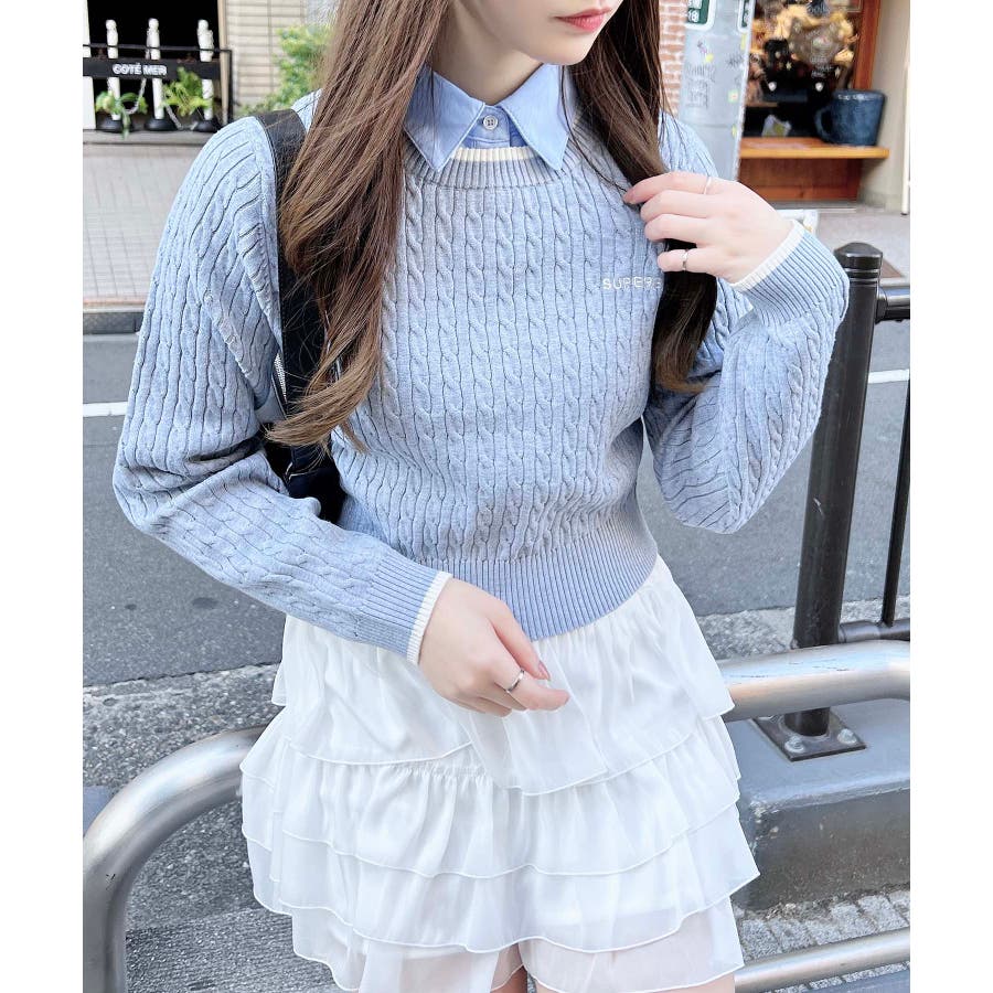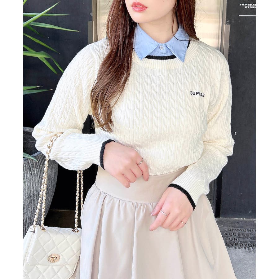 胸元のブランドロゴがアクセントになった襟付きケーブル編みニットです。