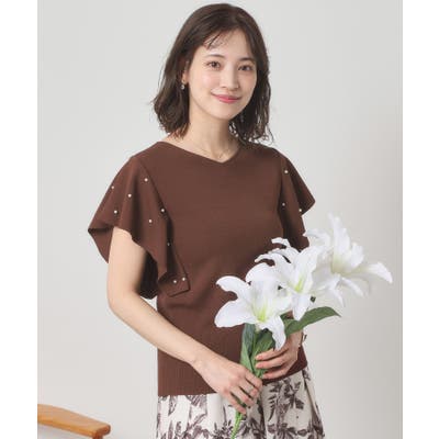 パール調モチーフを散りばめたフリル袖が甘さのあるデザインながらも、ニット素材なので落ち感があり上品な印象に。