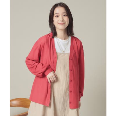 カジュアル感のある素材ですが、すっきりとしたVネックデザインできれいめスタイルにも合うデザインになっています。