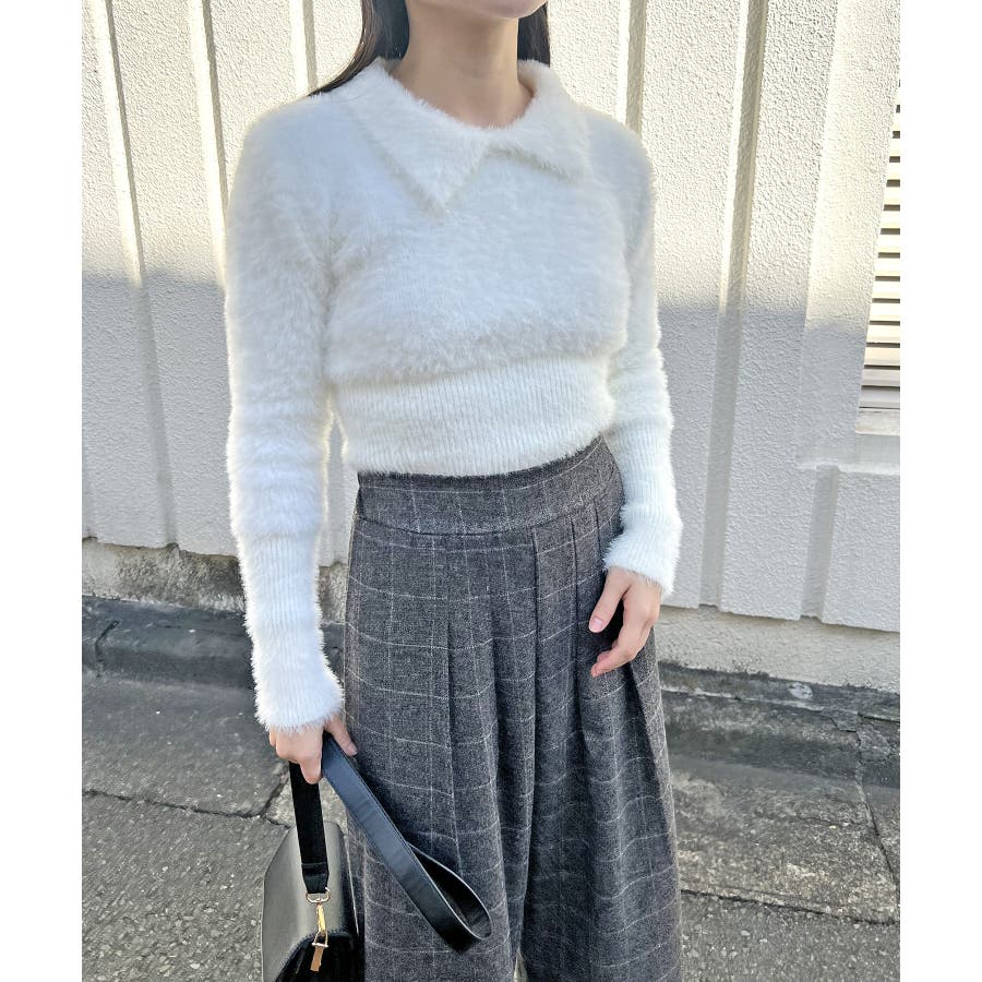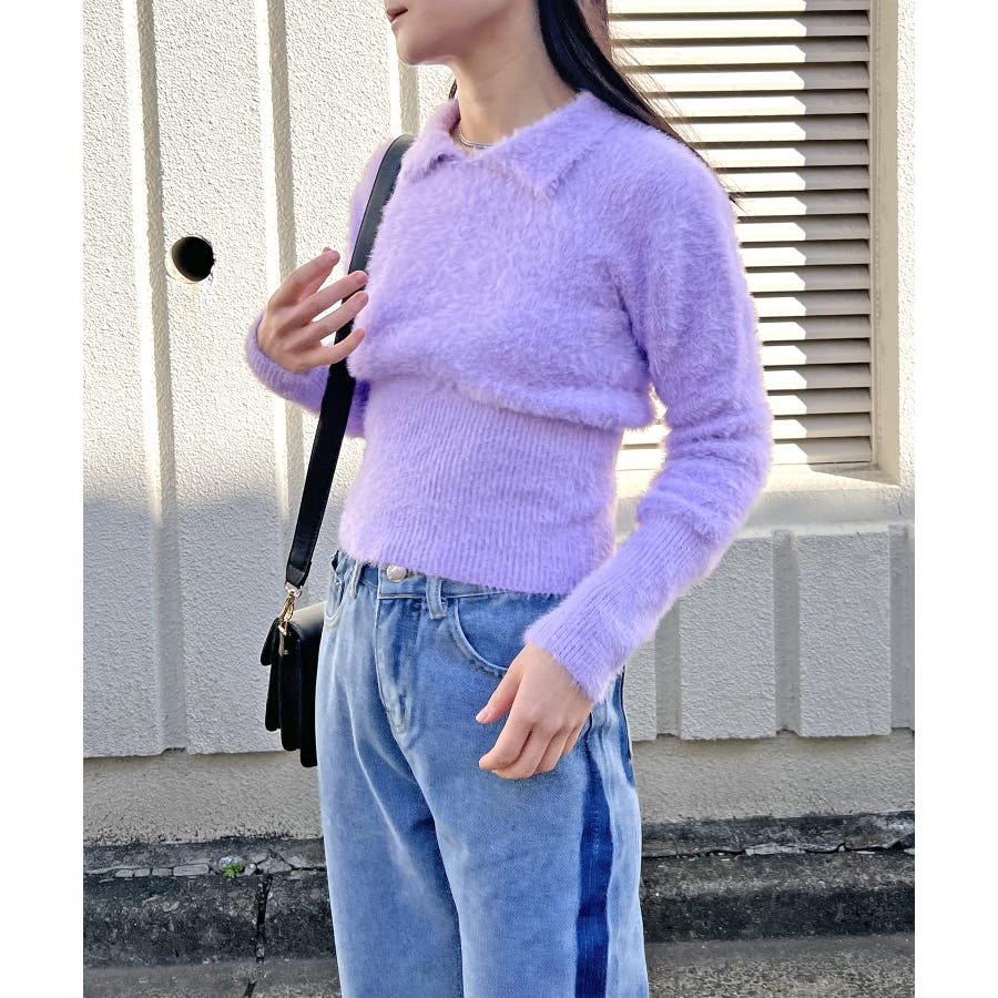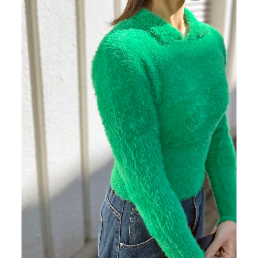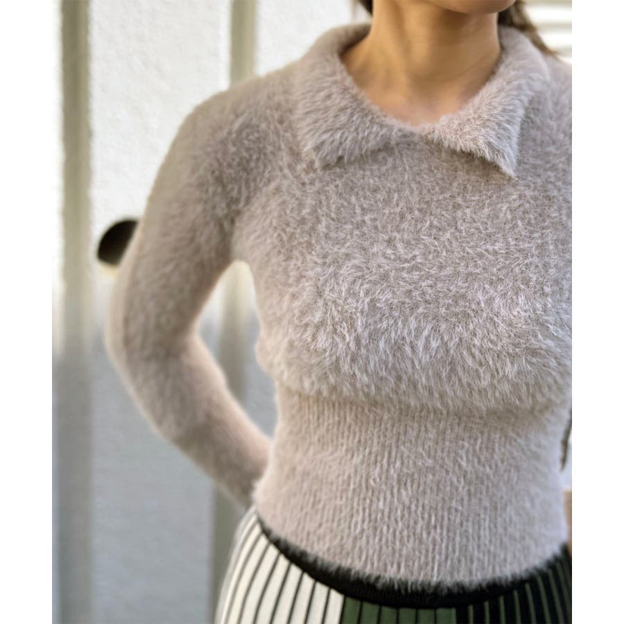 シャギー糸を使用した、衿付きニット。