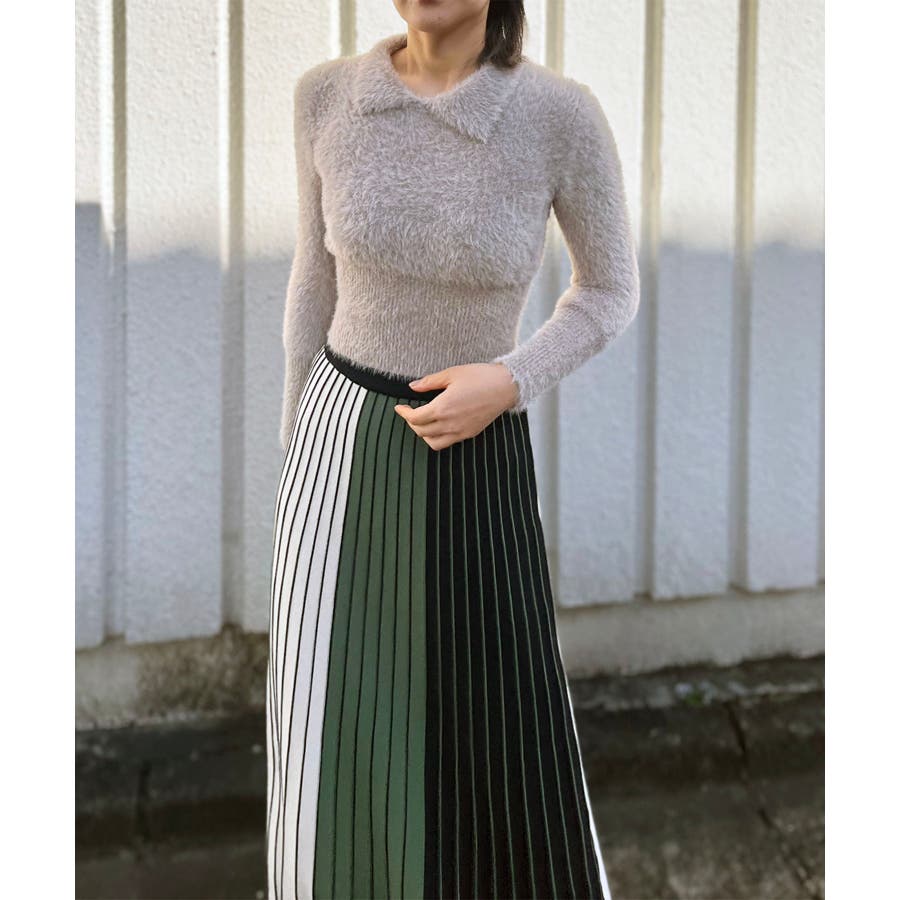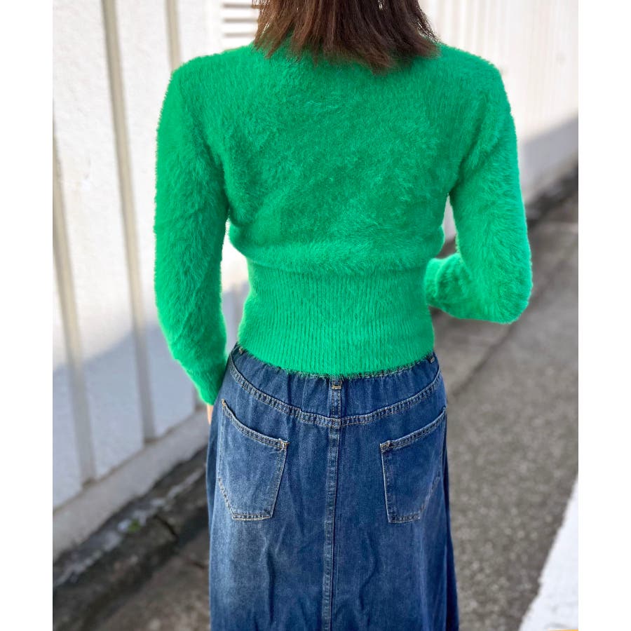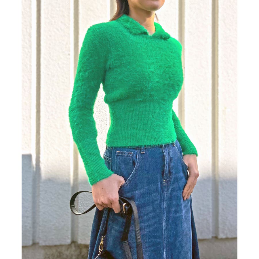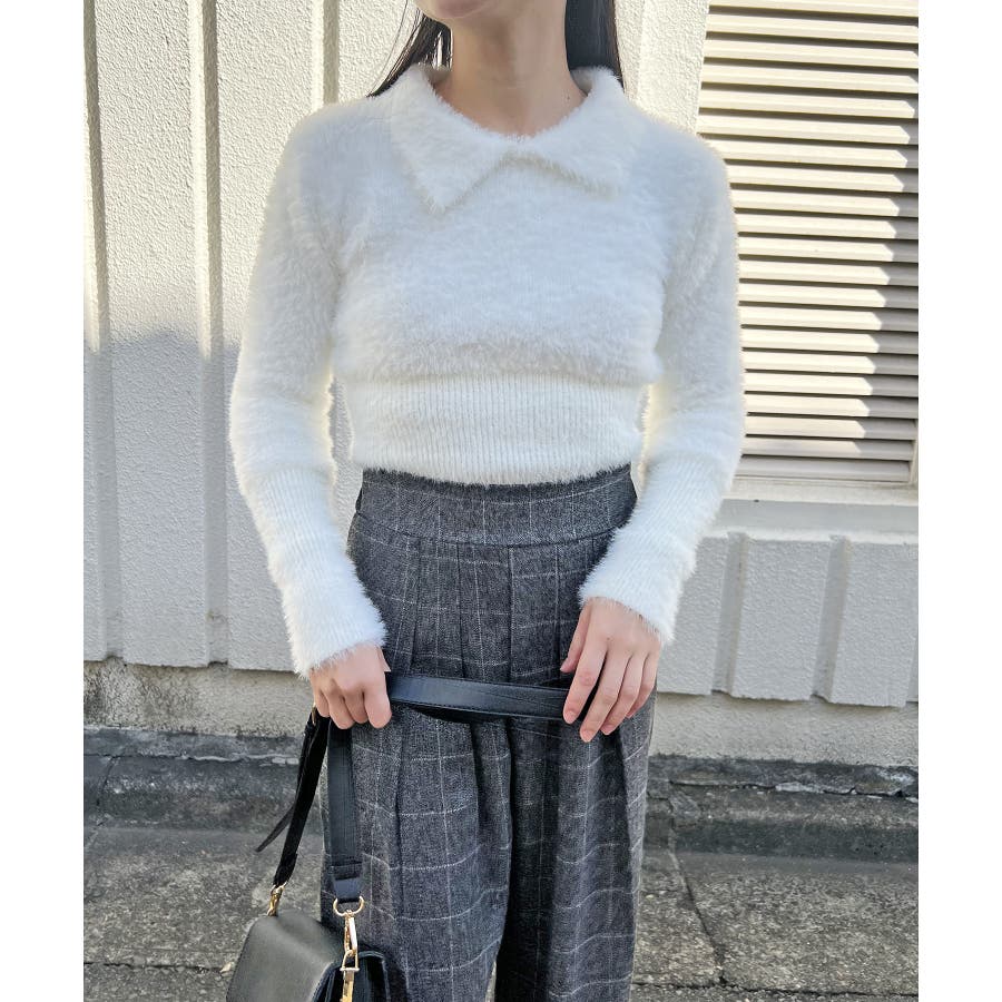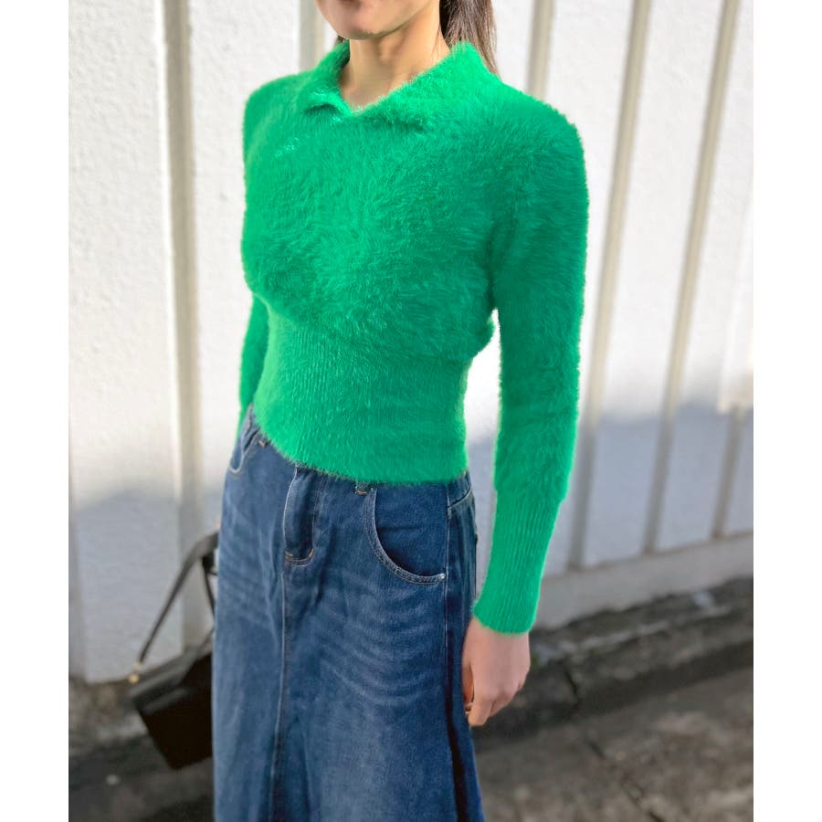 シャギー糸を使用した、衿付きニット。
