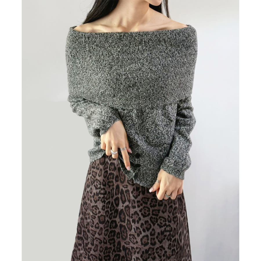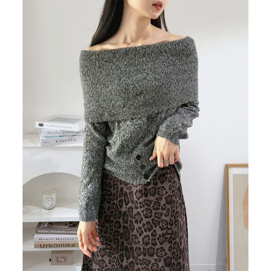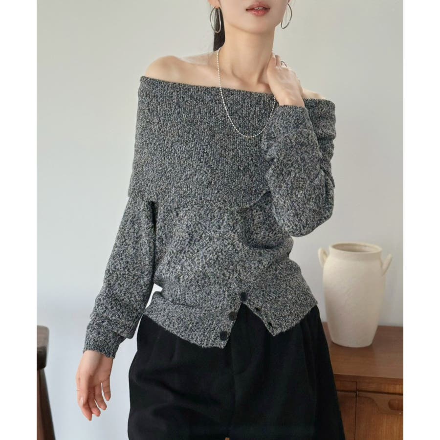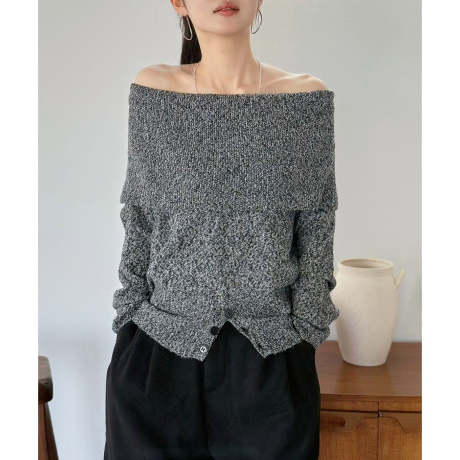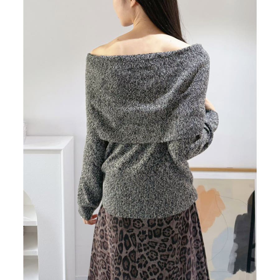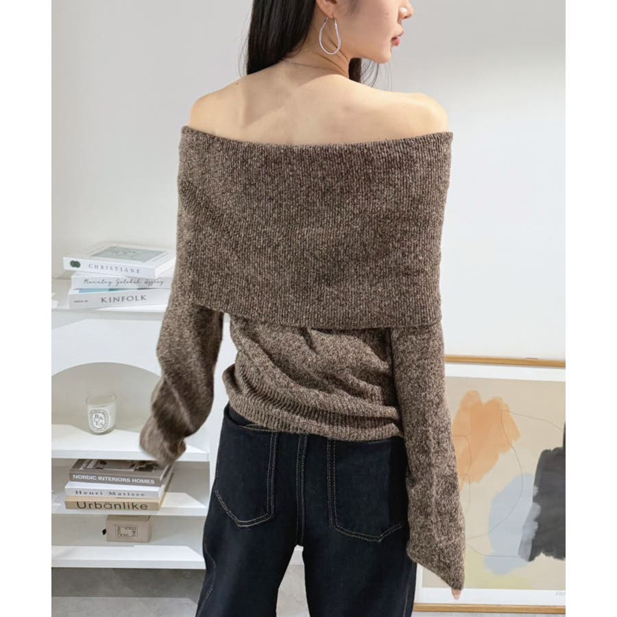 幅広の折り返し部分がエレガントなオフショルダーニット。