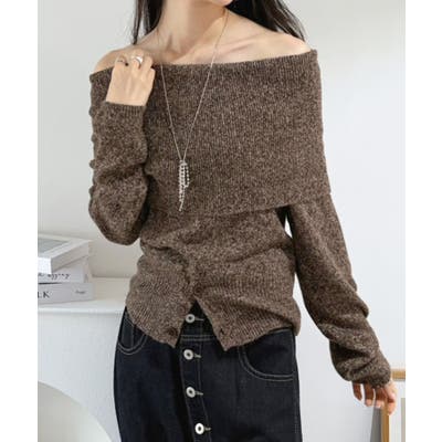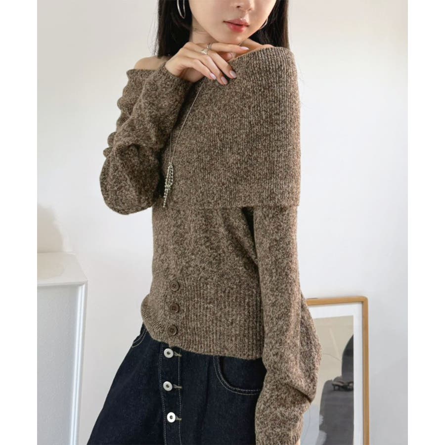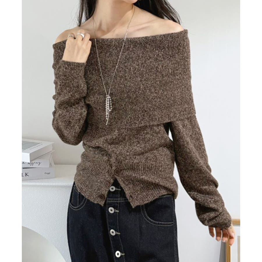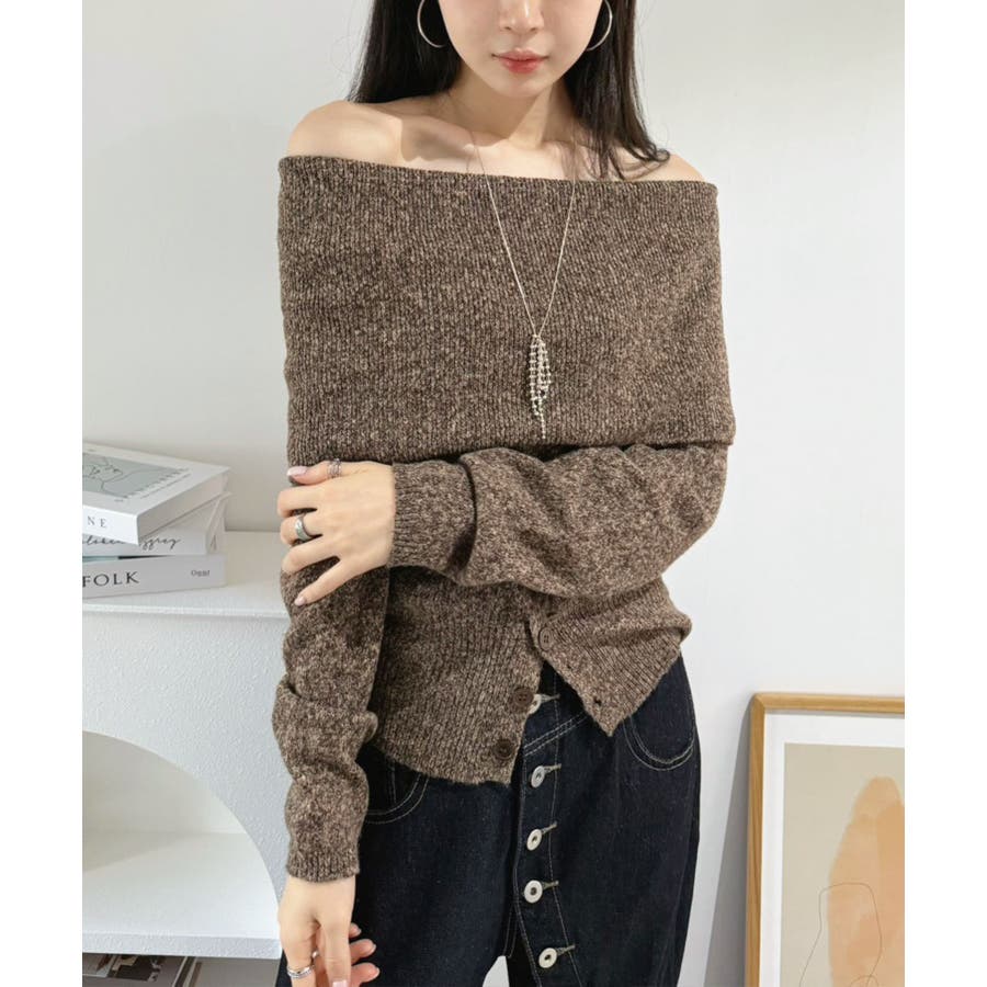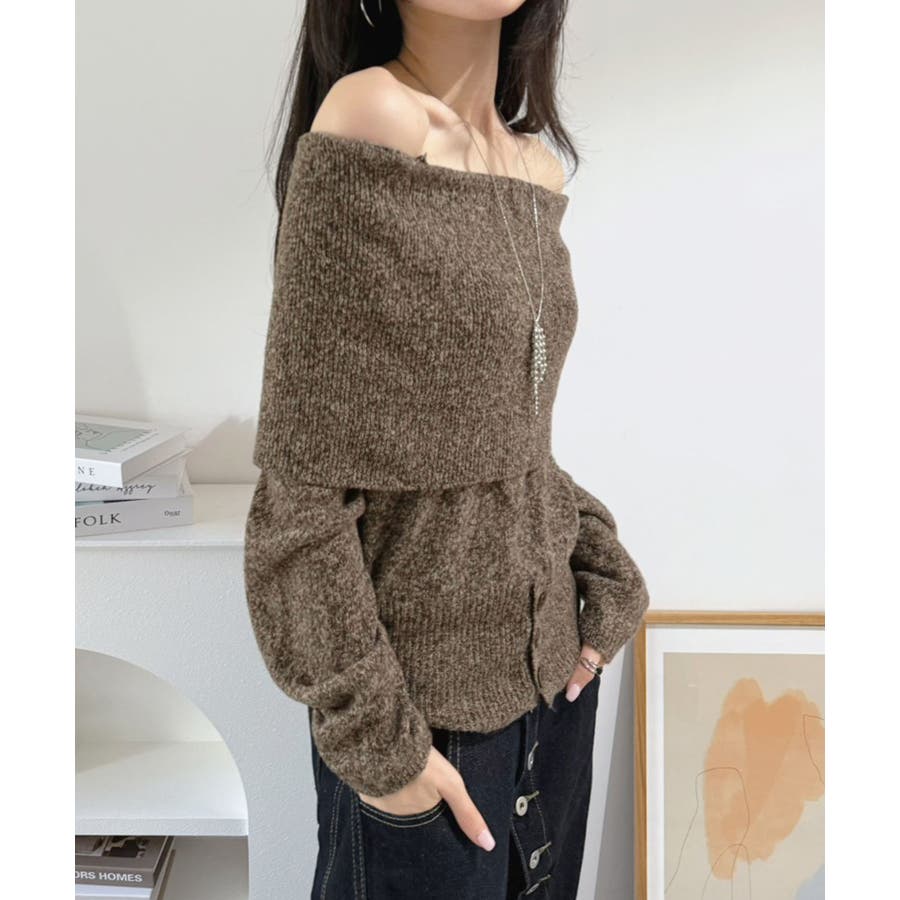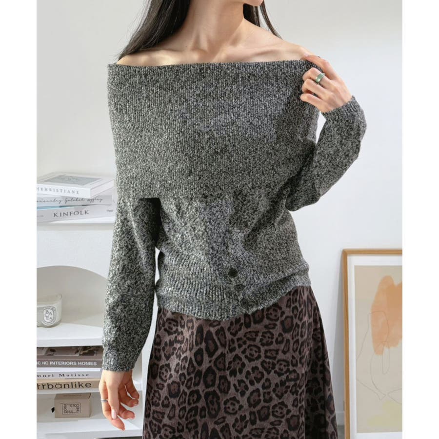 幅広の折り返し部分がエレガントなオフショルダーニット。