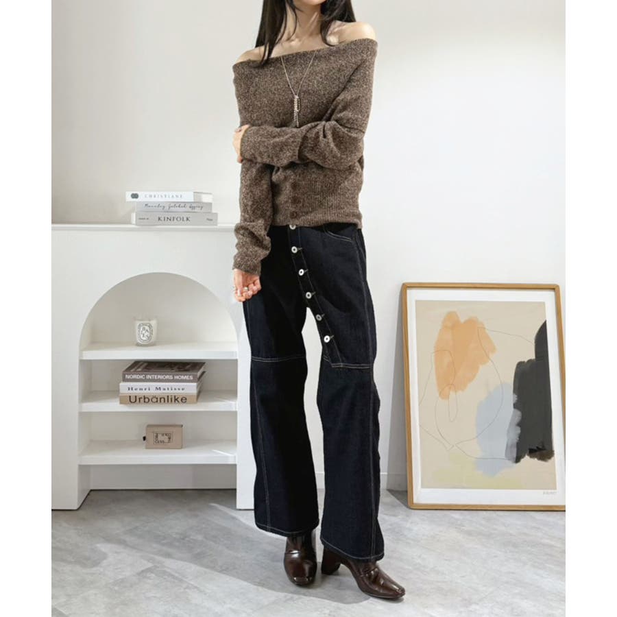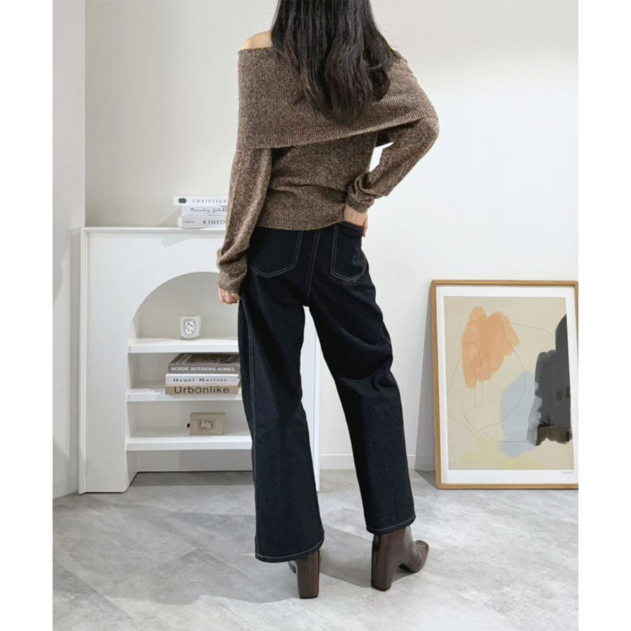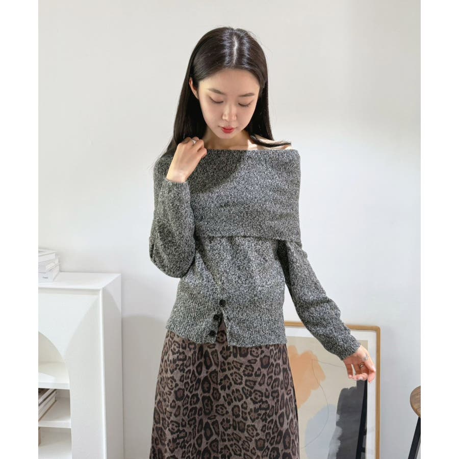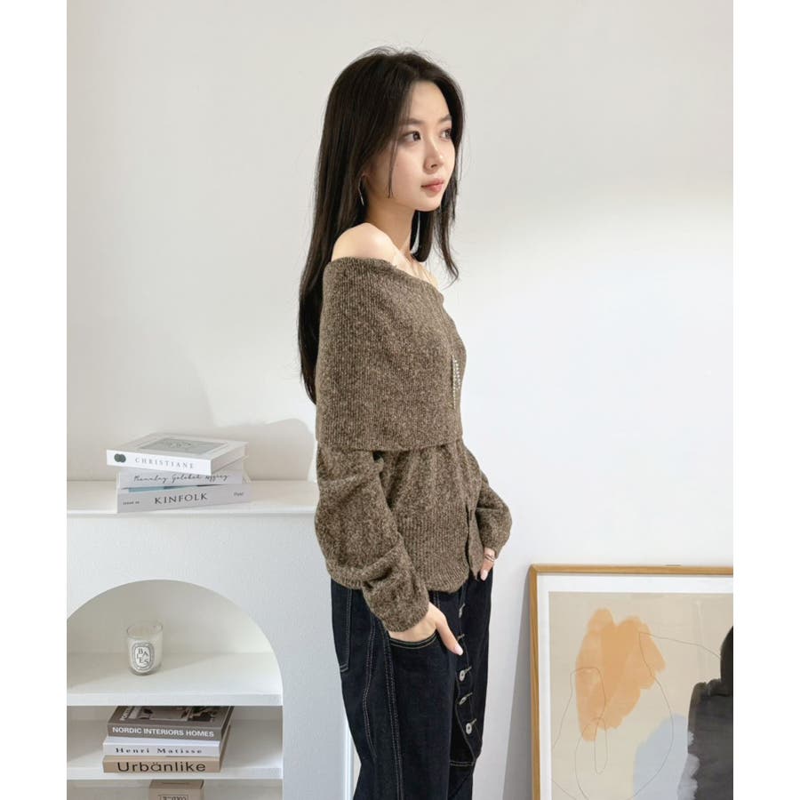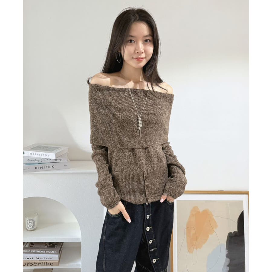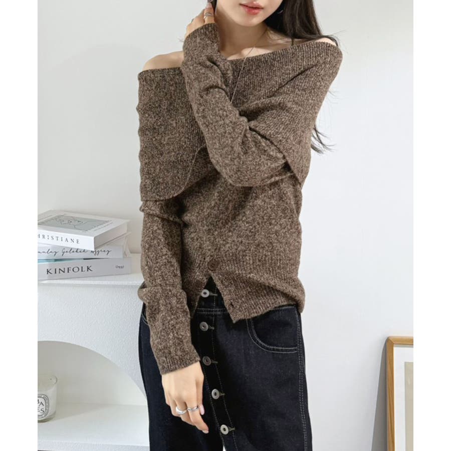 幅広の折り返し部分がエレガントなオフショルダーニット。