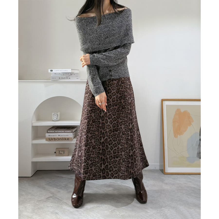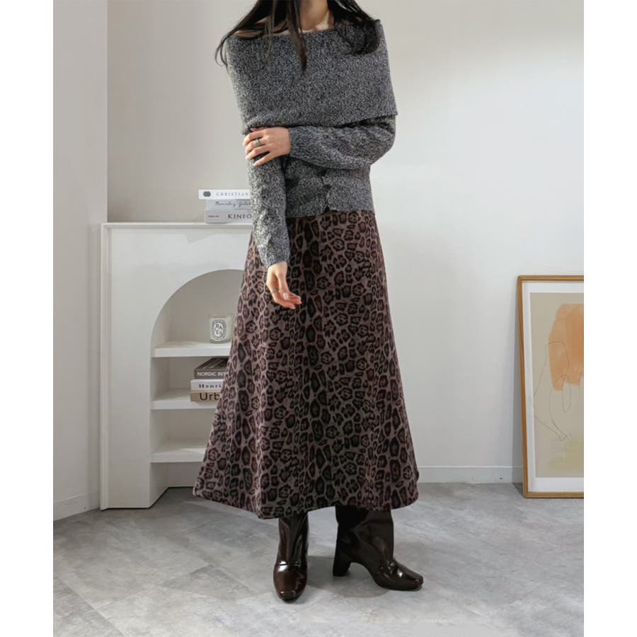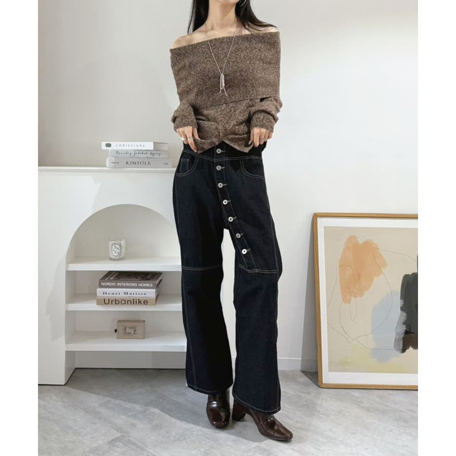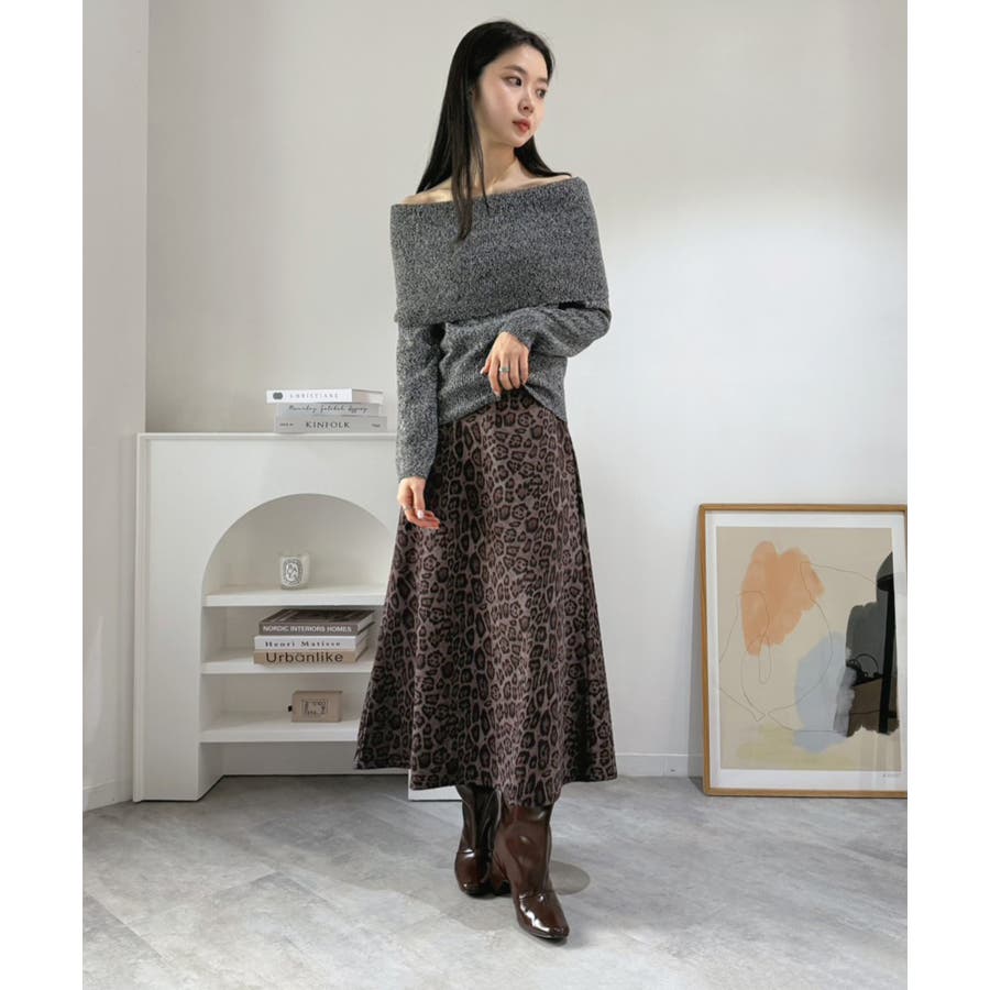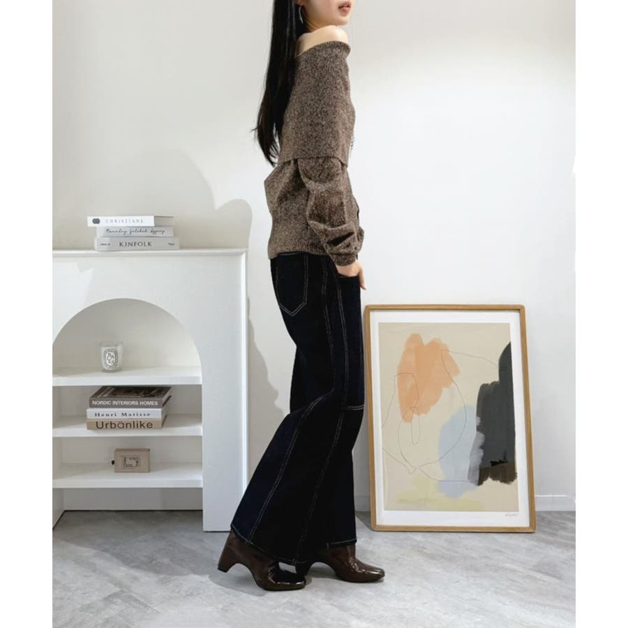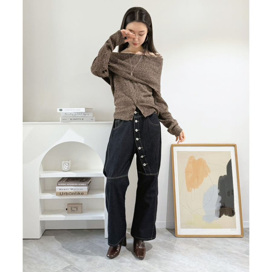 幅広の折り返し部分がエレガントなオフショルダーニット。