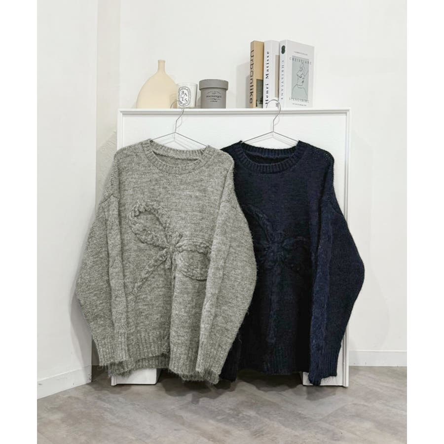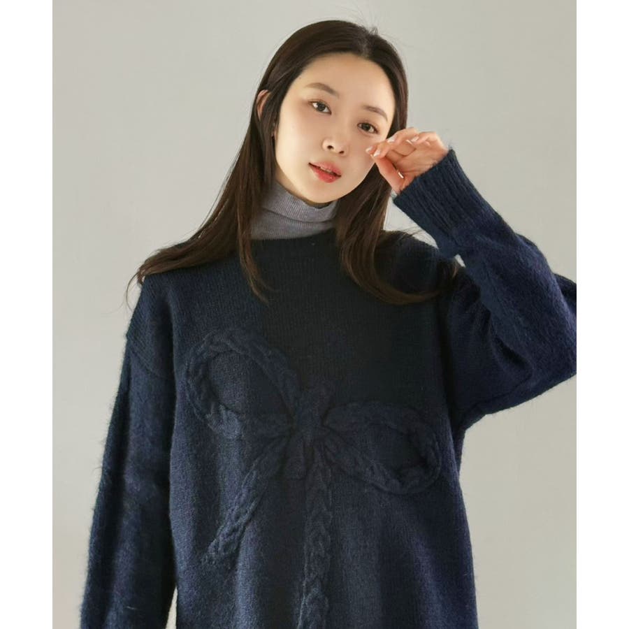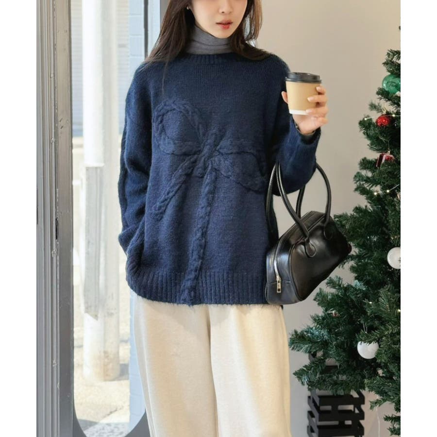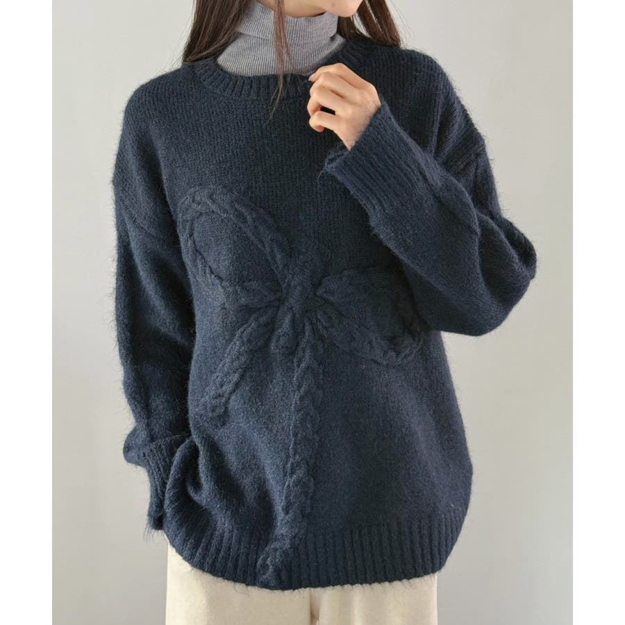 大きなリボンディテールがポイントのニットプルオーバー。