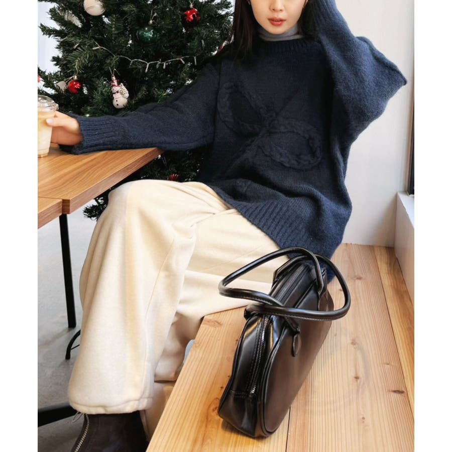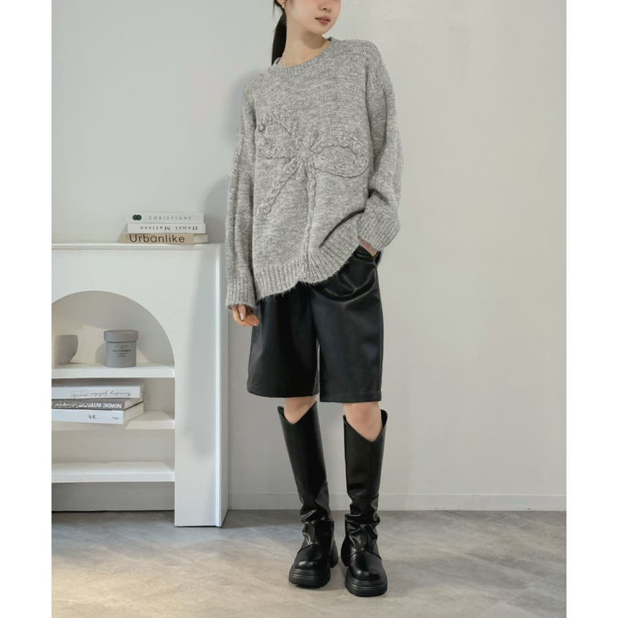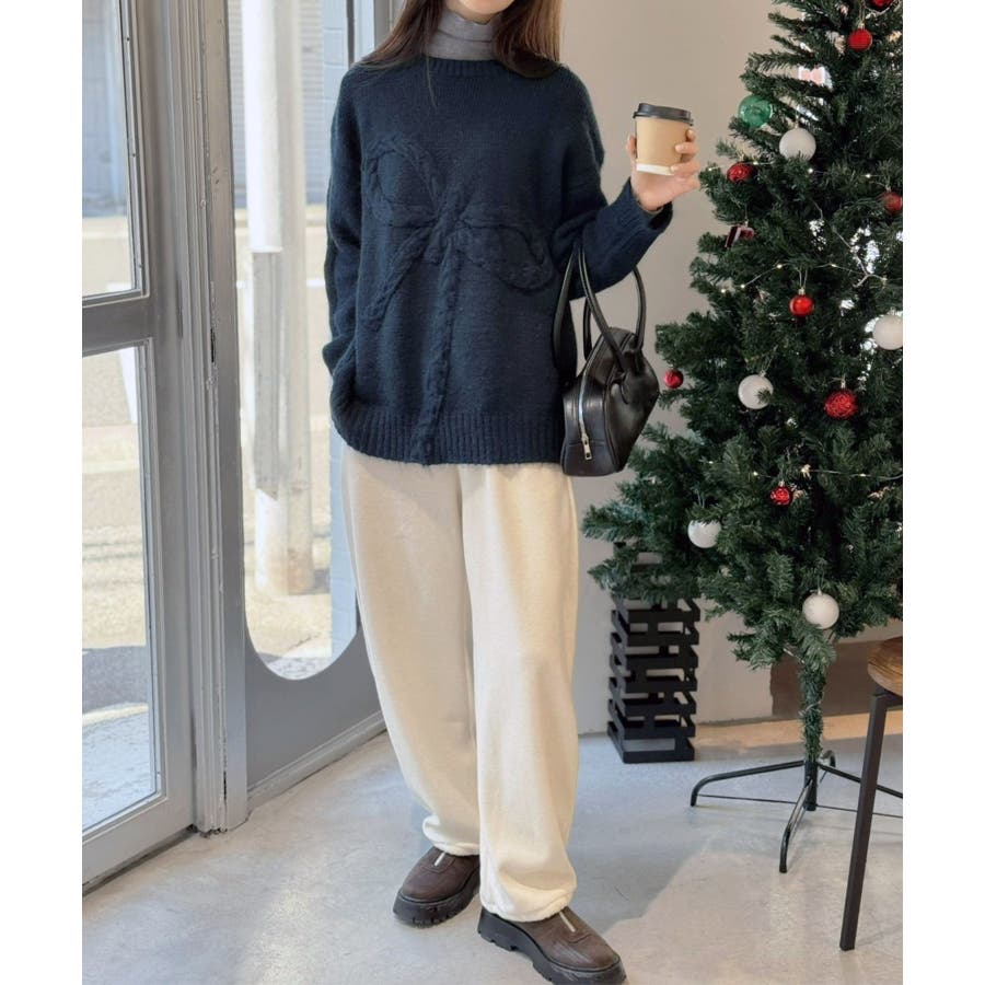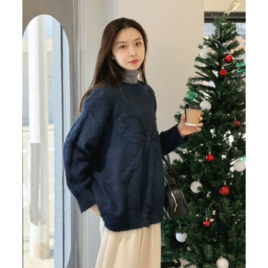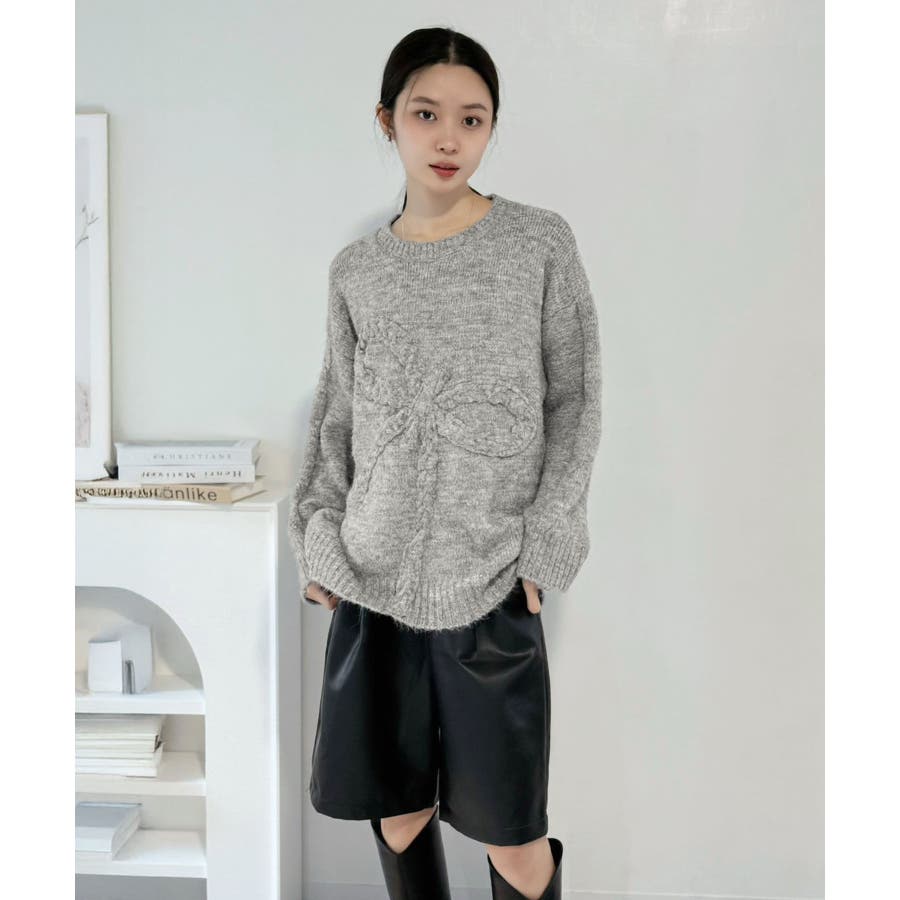 大きなリボンディテールがポイントのニットプルオーバー。