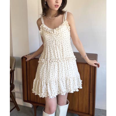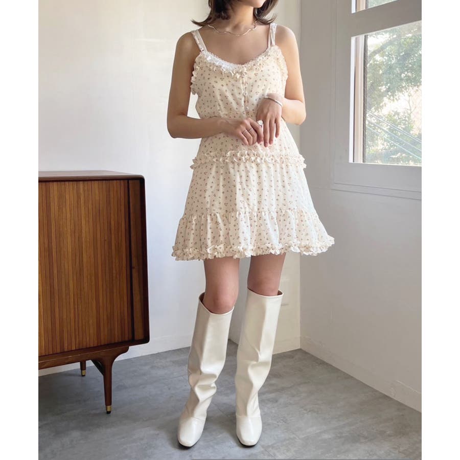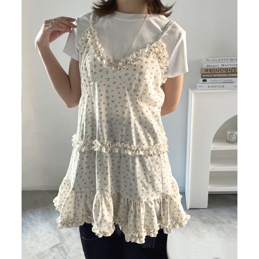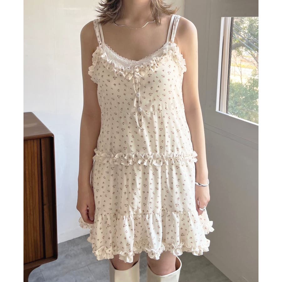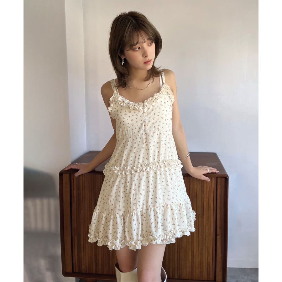 女性らしい胸元の切り替えデザインとフリルが目を惹く