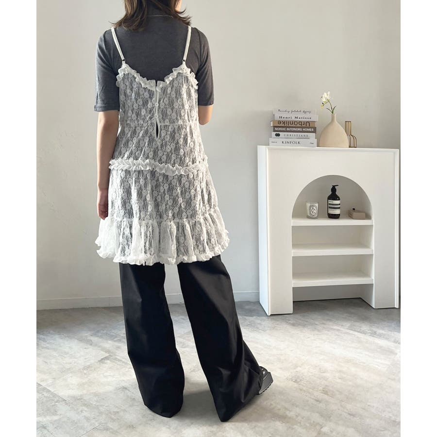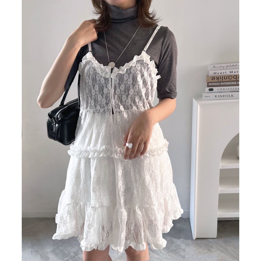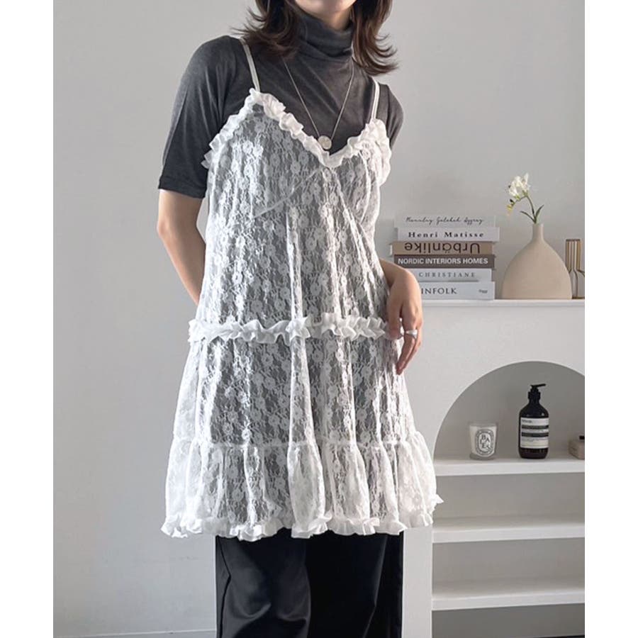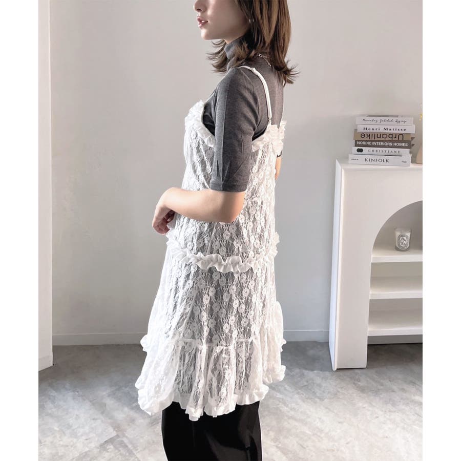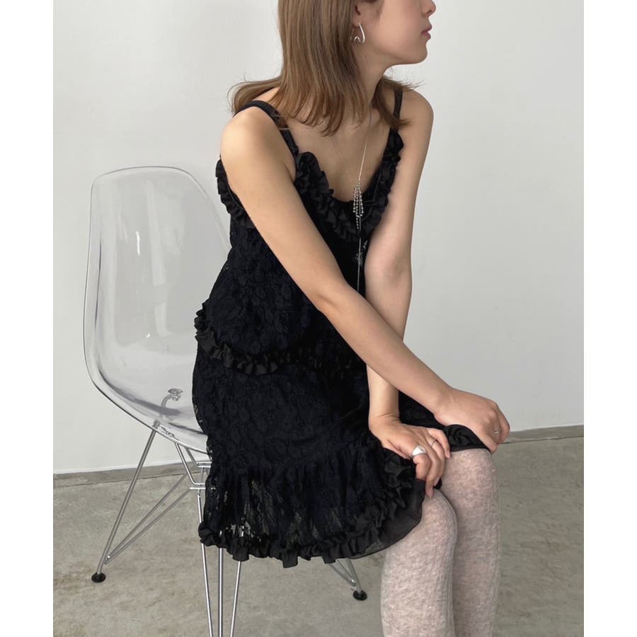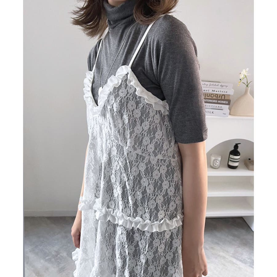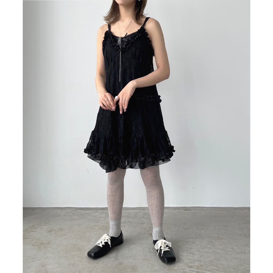 女性らしい胸元の切り替えデザインとフリルが目を惹く