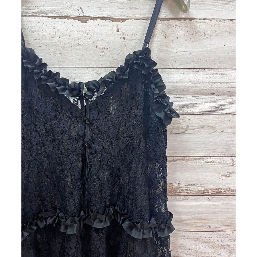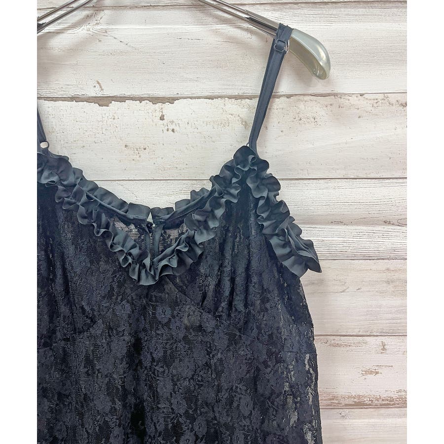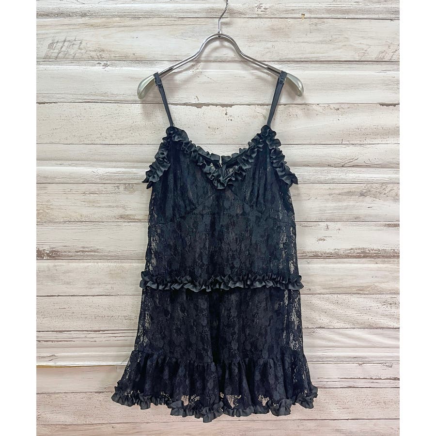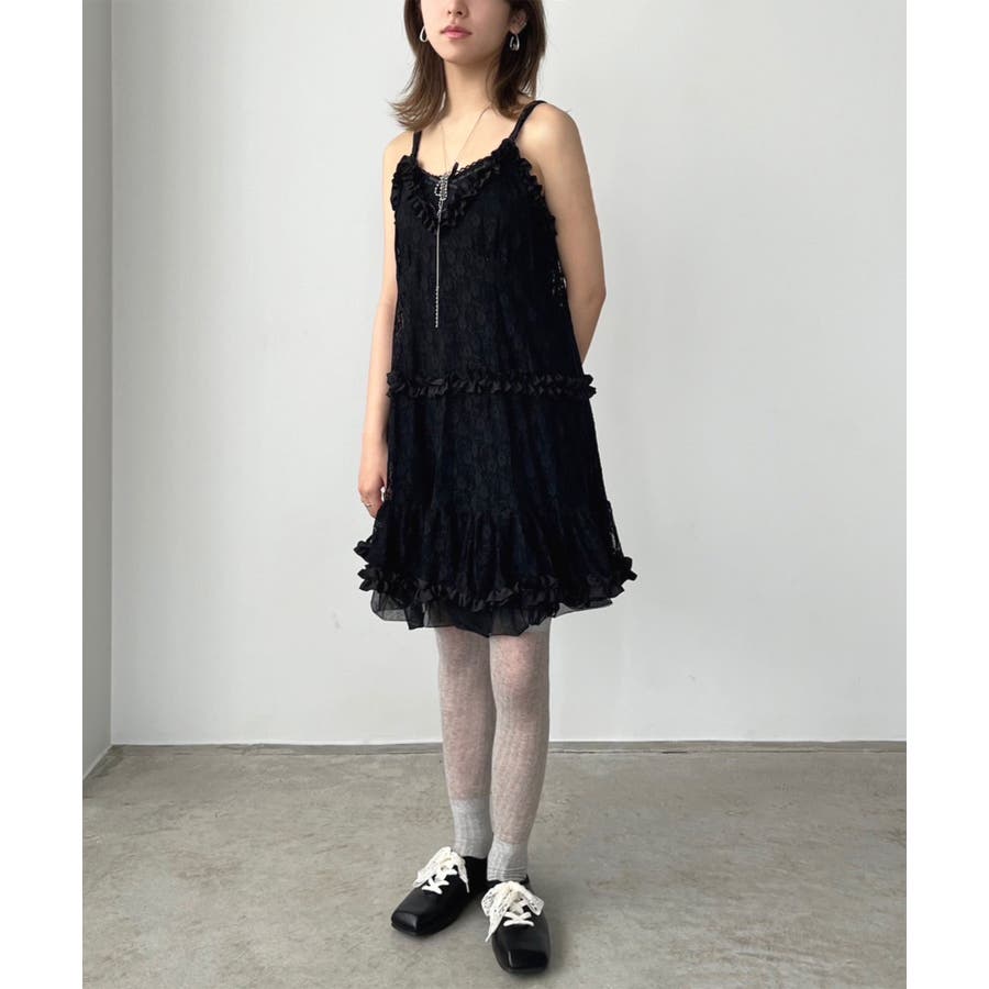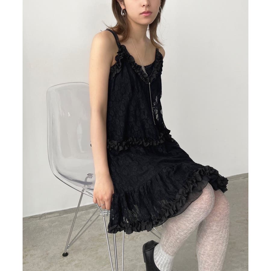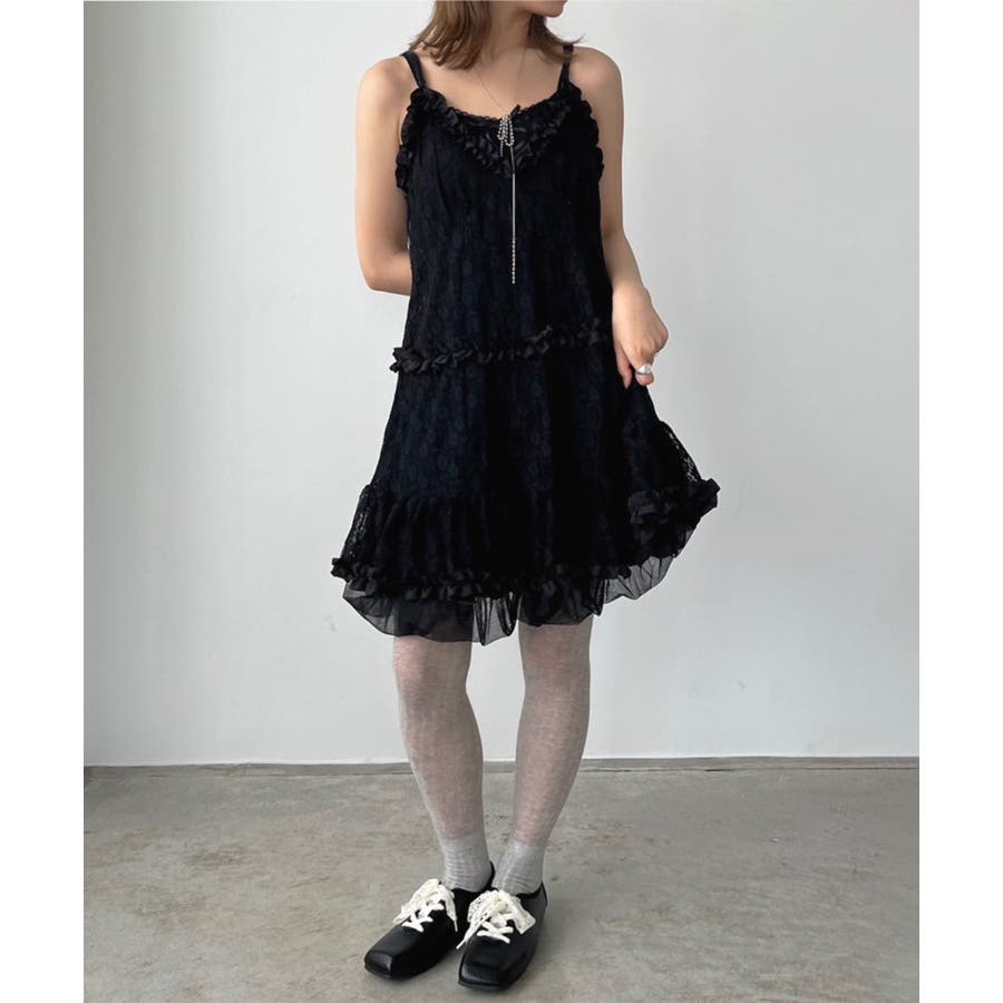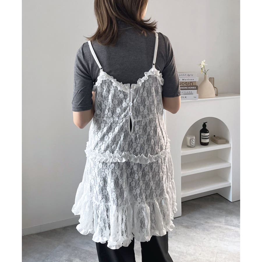 女性らしい胸元の切り替えデザインとフリルが目を惹く