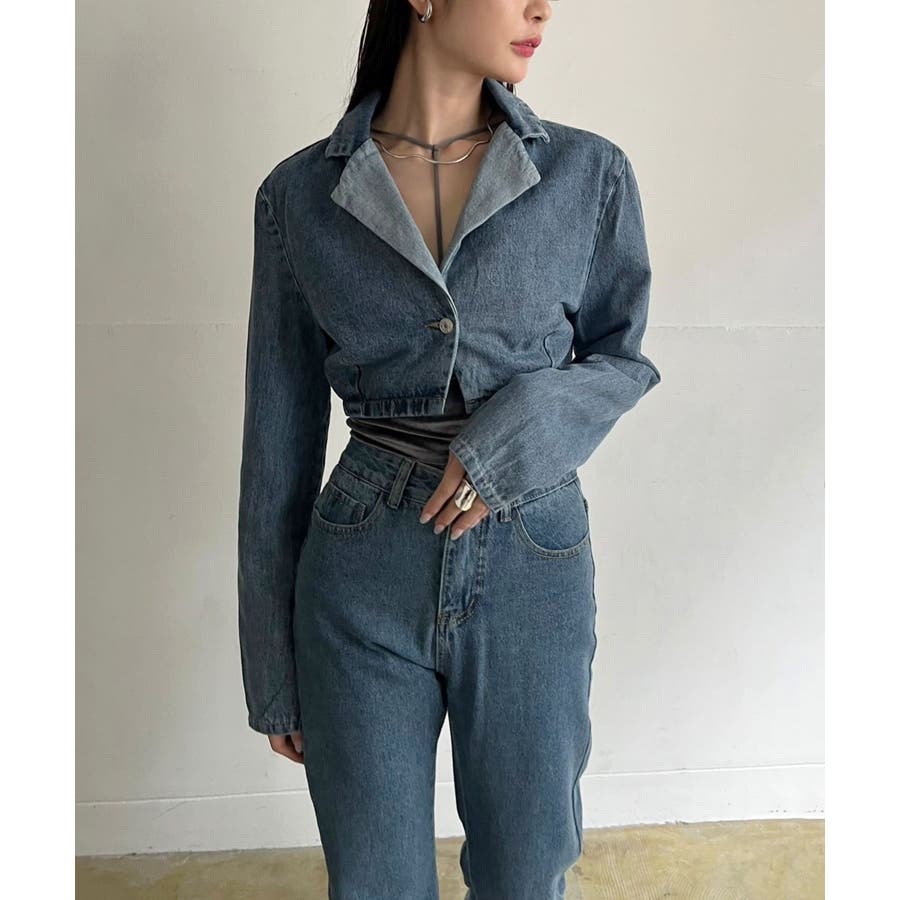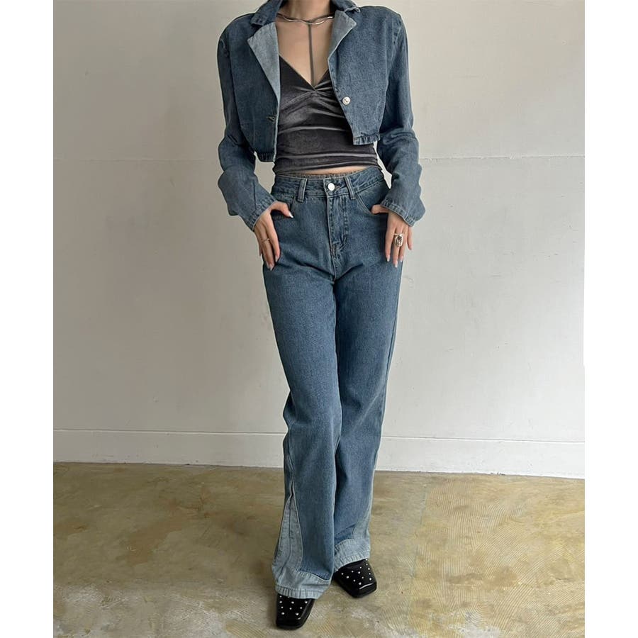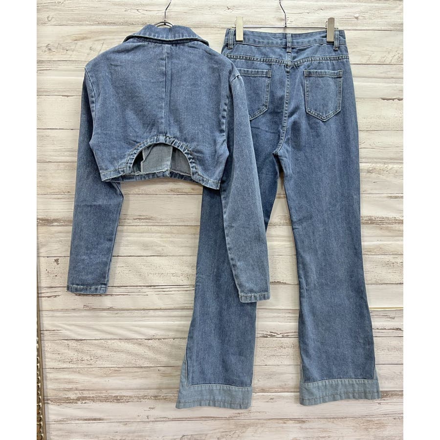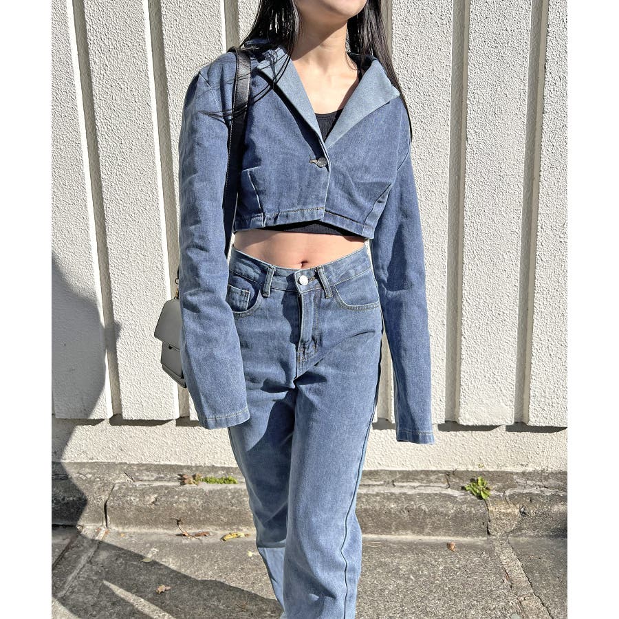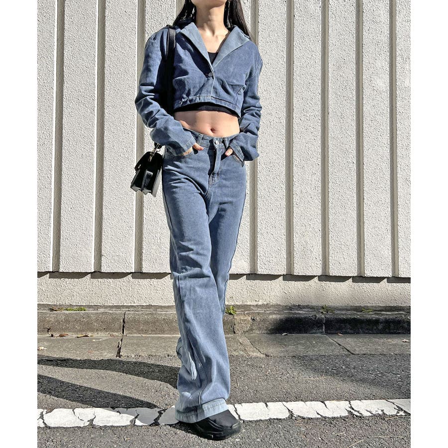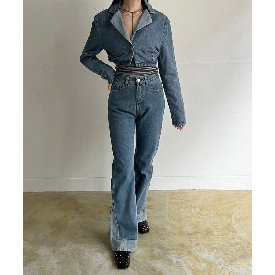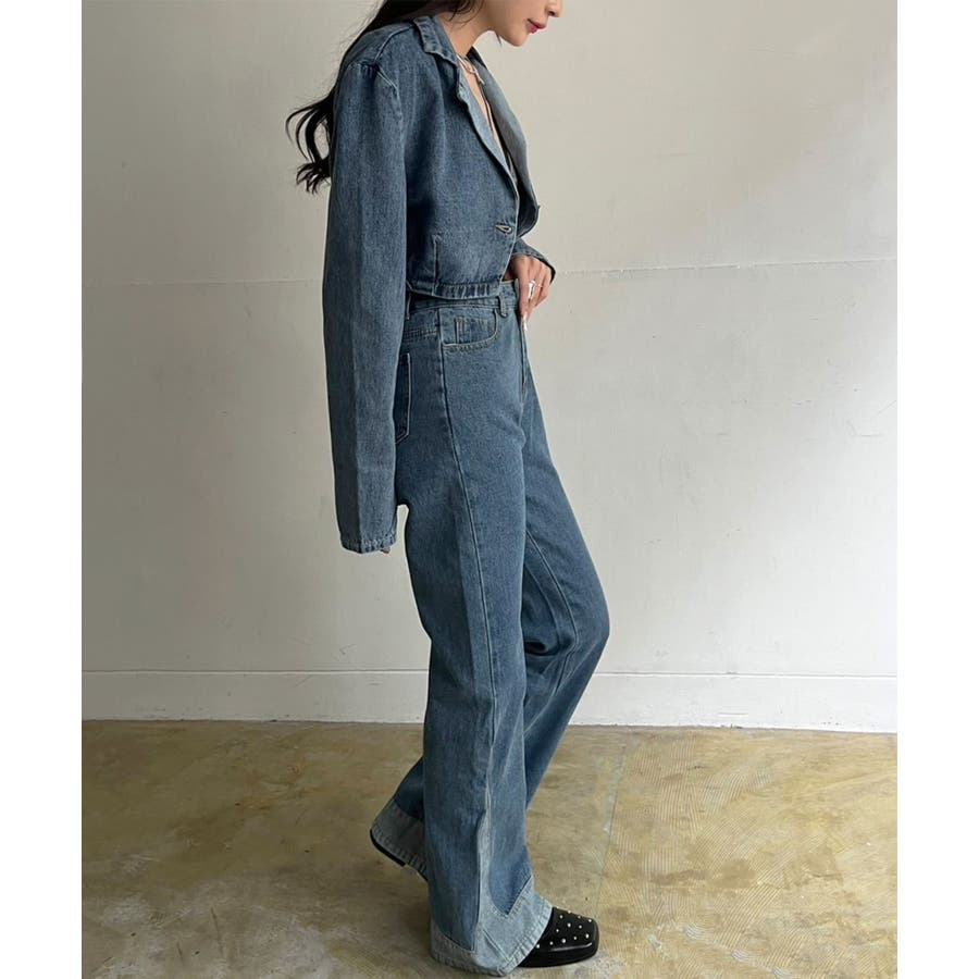 クロップドテーラージャケット×ベルボトムルーズパンツ デニムセットアップ
