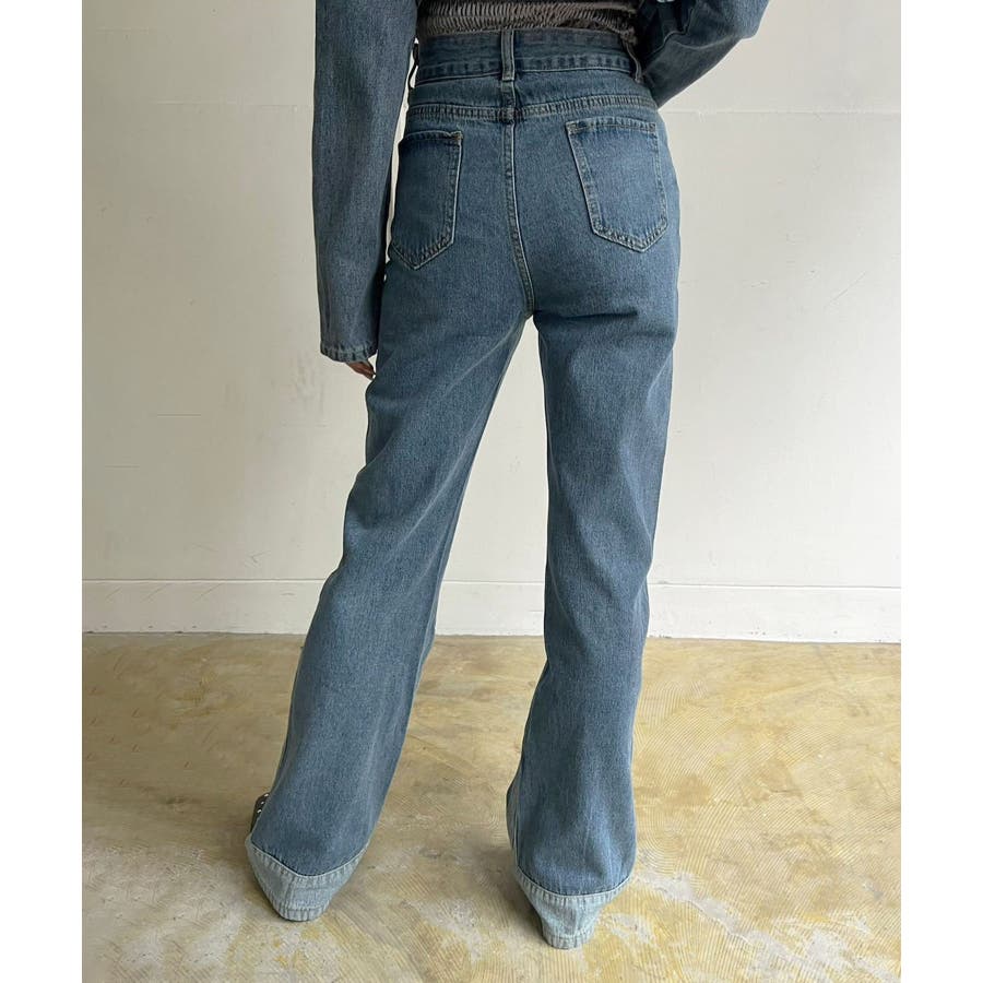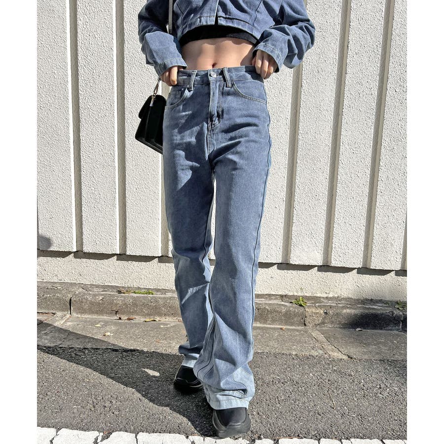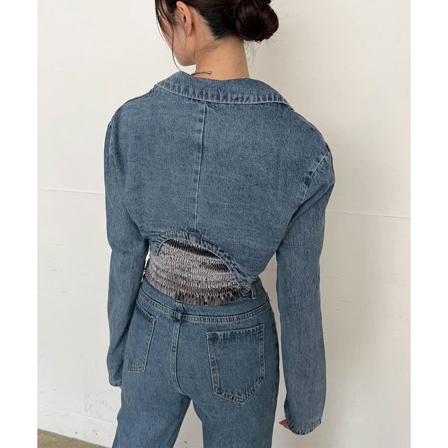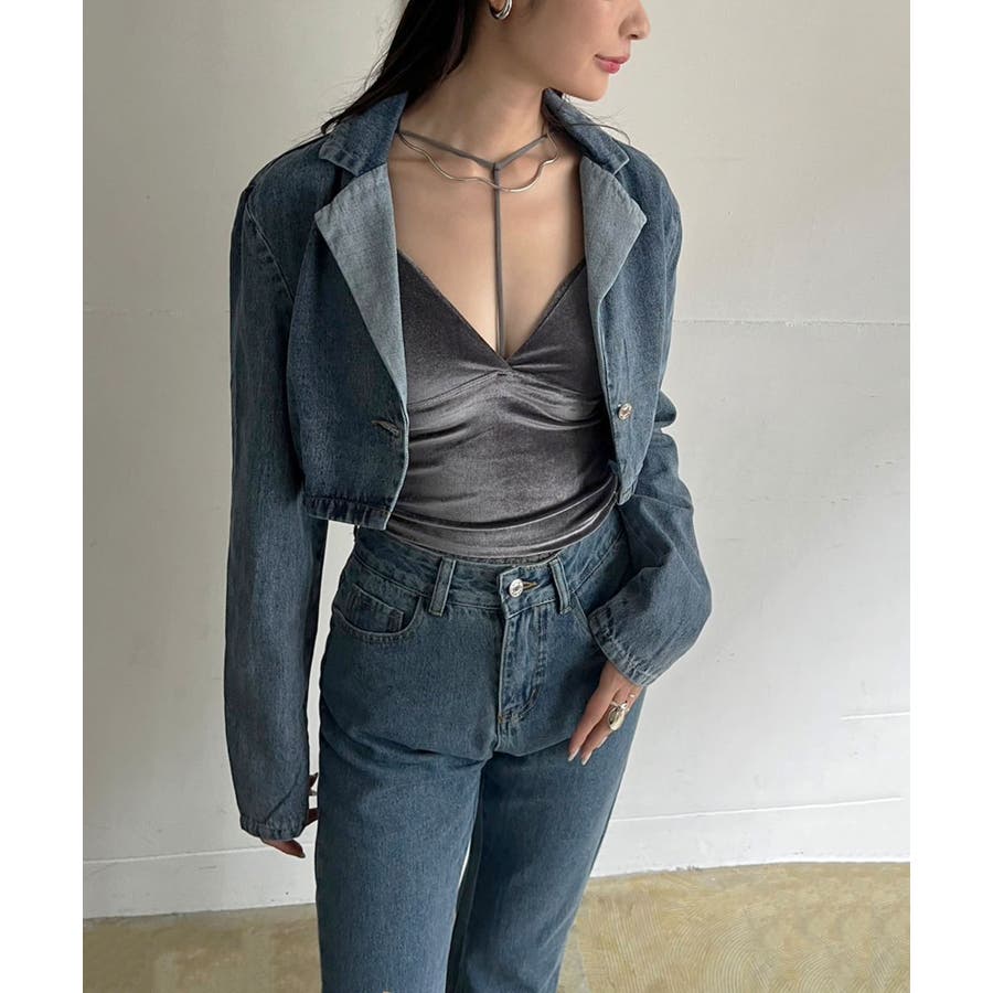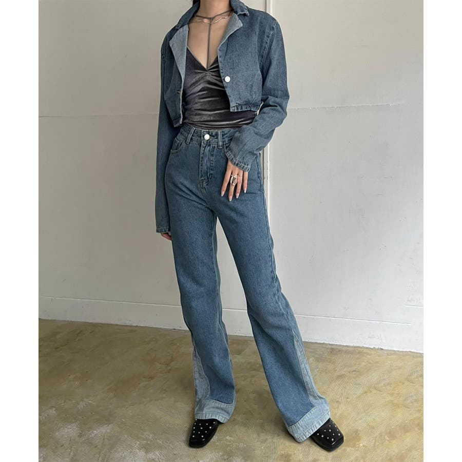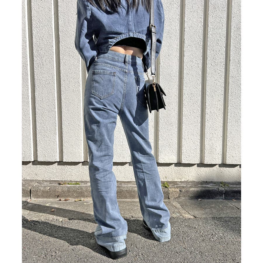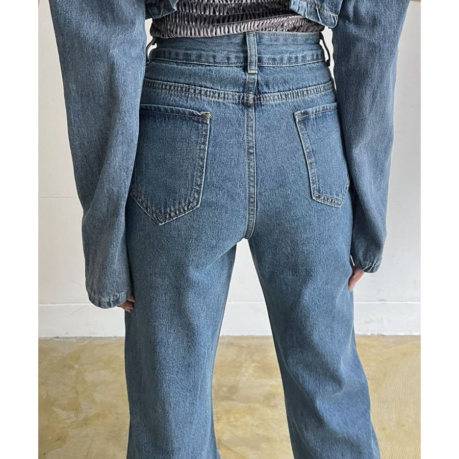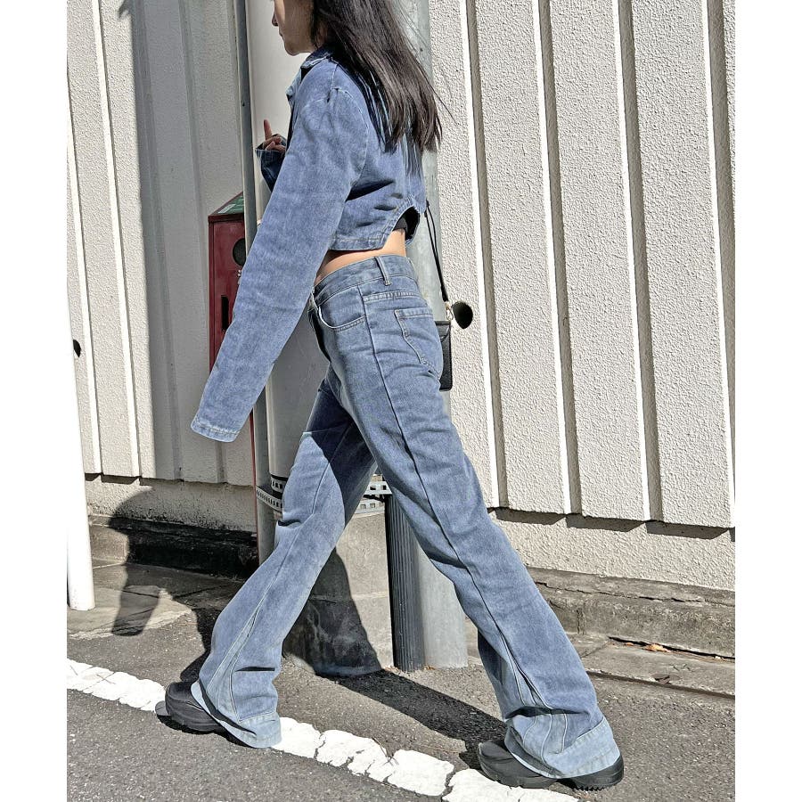 クロップドテーラージャケット×ベルボトムルーズパンツ デニムセットアップ