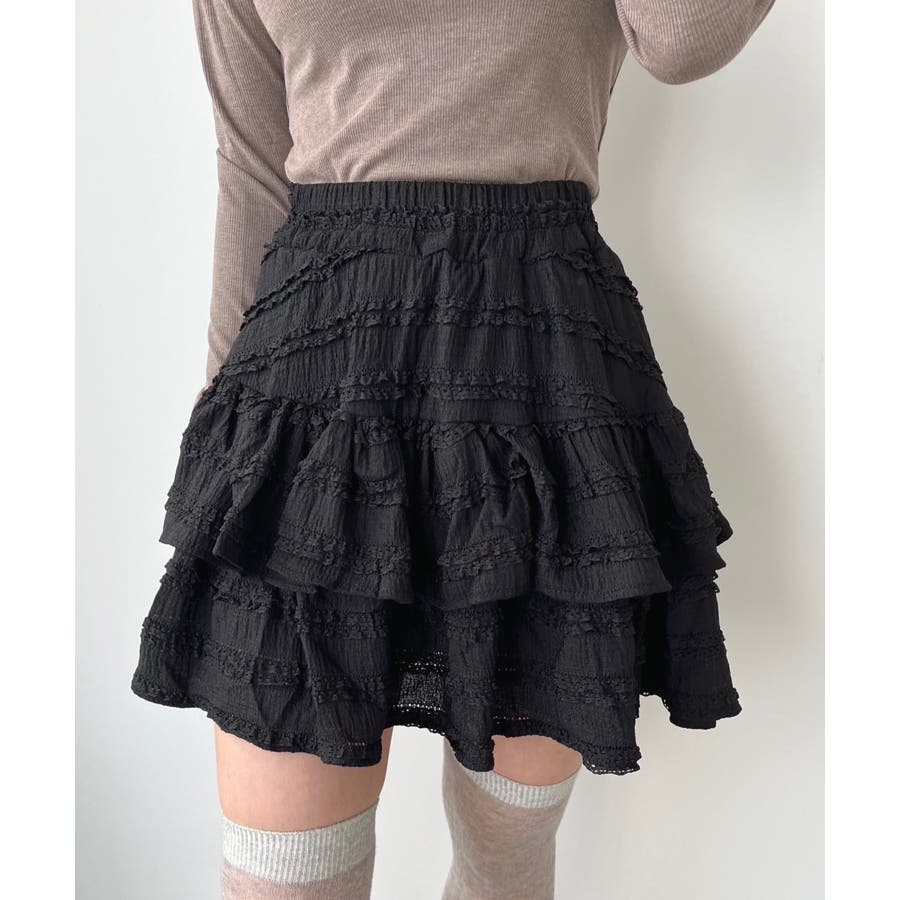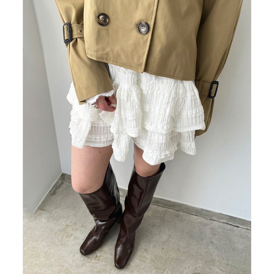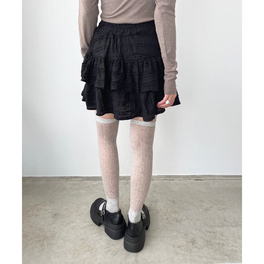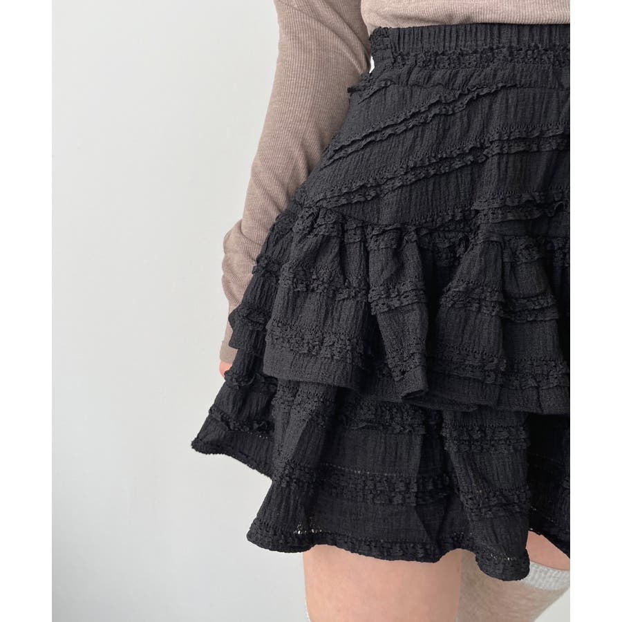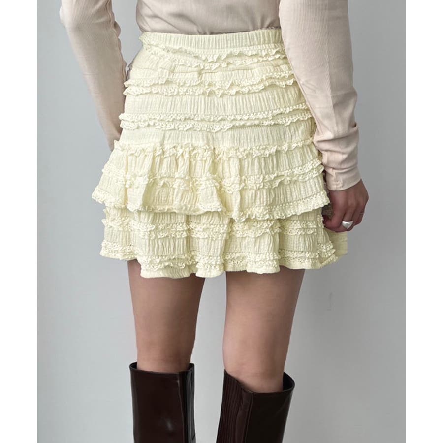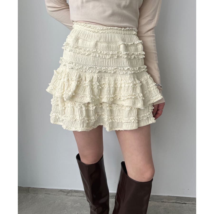レースのようなフリルがついた生地で仕立てたミニスカート。