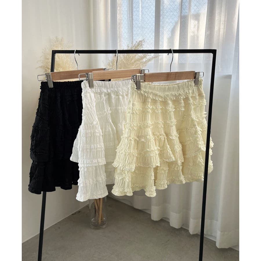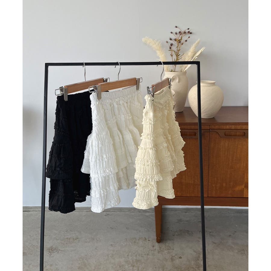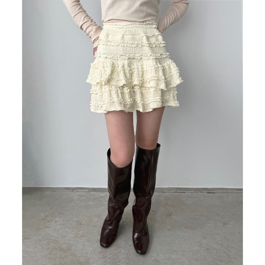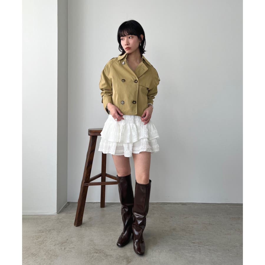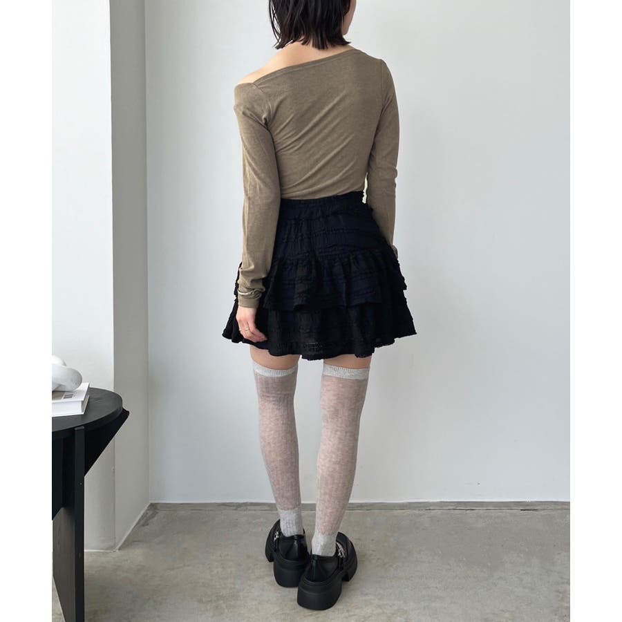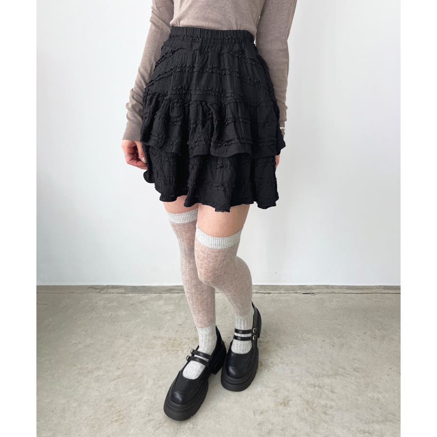 レースのようなフリルがついた生地で仕立てたミニスカート。