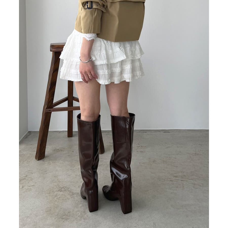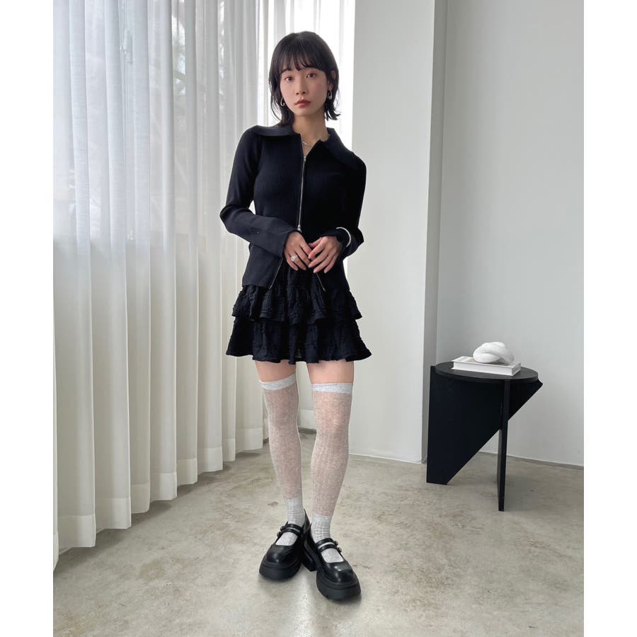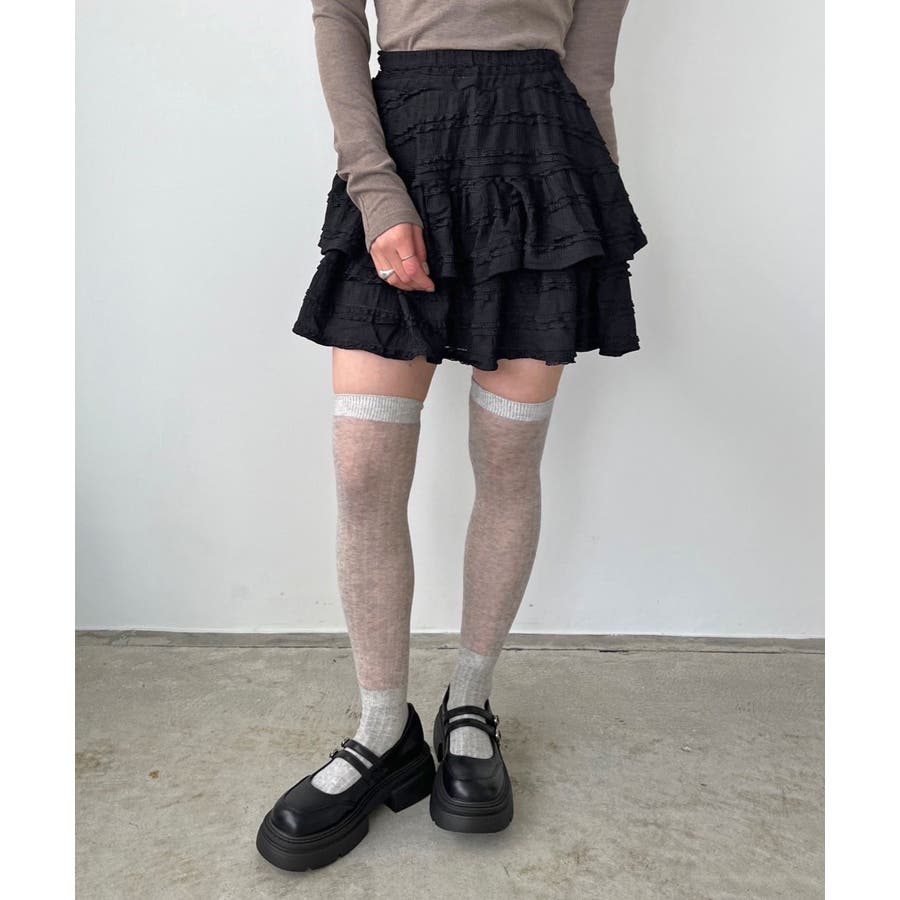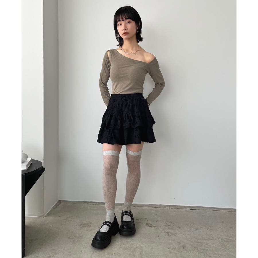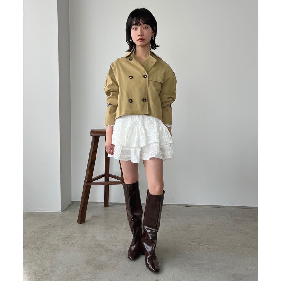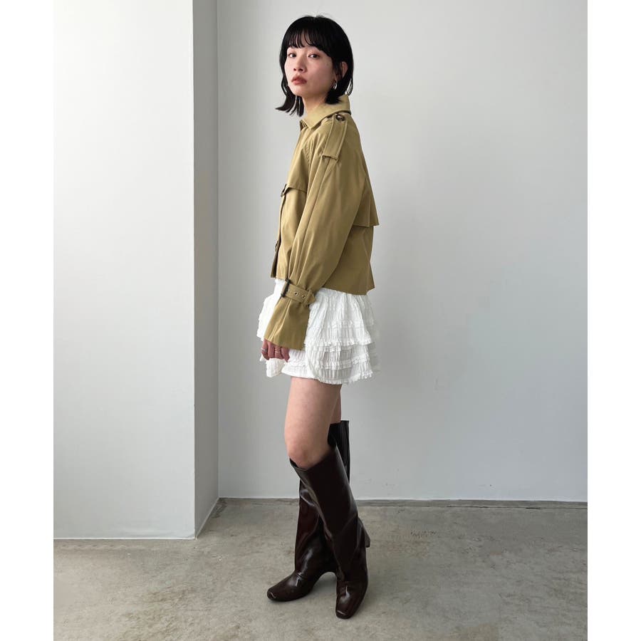 レースのようなフリルがついた生地で仕立てたミニスカート。
